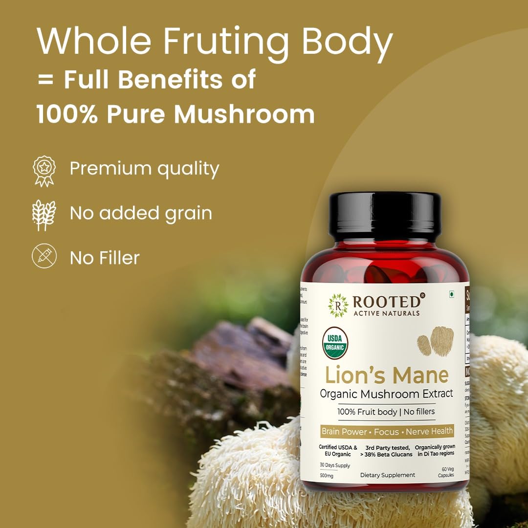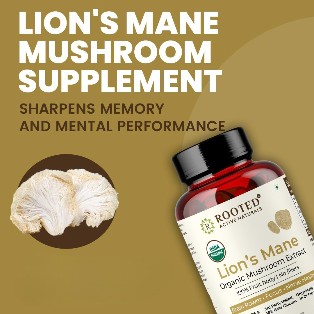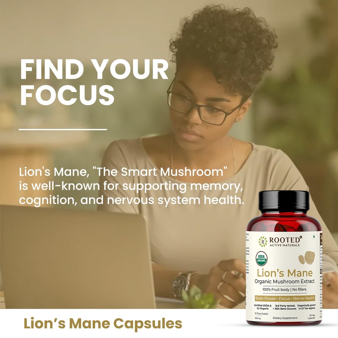 Rooted Active's Lion's Mane Mushroom for Brain Health Support - Mushroom Support for Focus & Memory Function - Immune & Nervous System Supplement | USDA Organic | 60 Caps