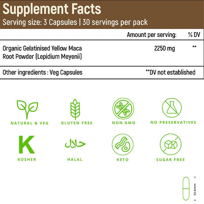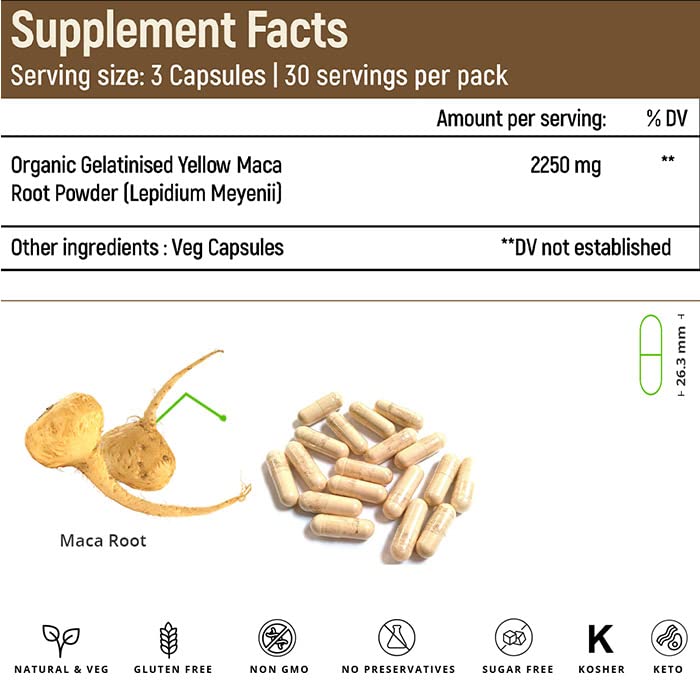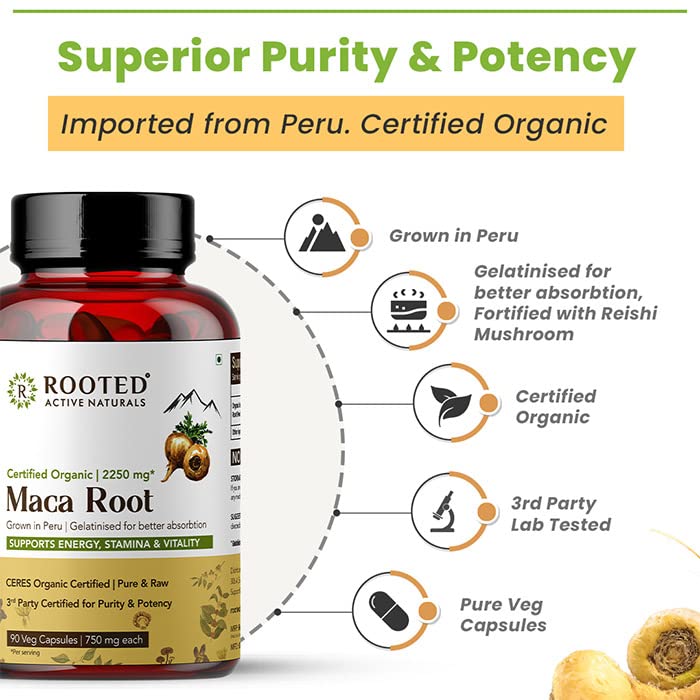 Rooted Actives Maca Root Capsules (90 Veg Caps 750 Mg) | Stamina Virility Hormonal Support | Imported From Peru Certified Organic Gelatinised