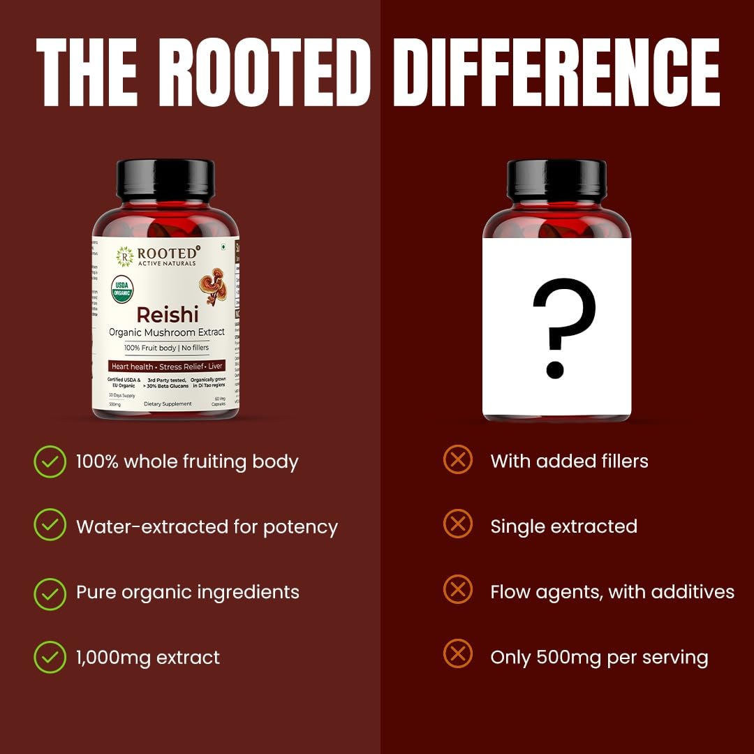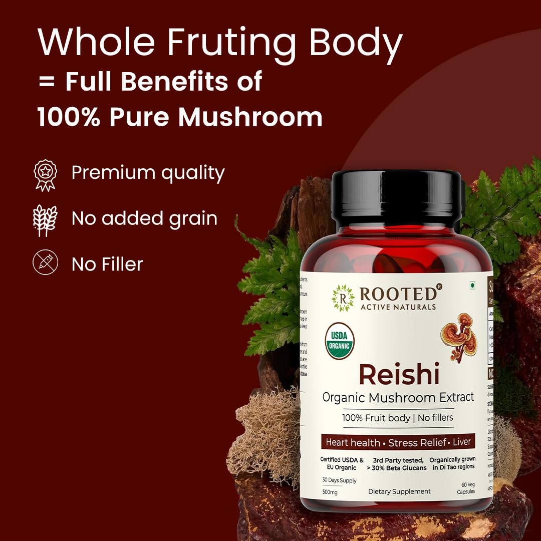 Rooted Active's Reishi Mushroom - Heart & Immune Health Support Supplement | Mushroom Supplement to Support Energy Mood Sleep & Aid Overall Well-Being - 60 Capsules