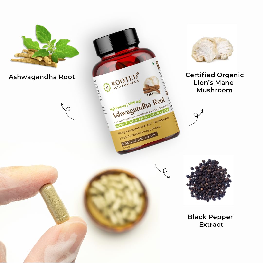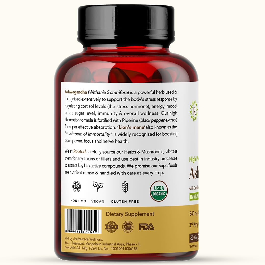 Rooted Ashwagandha Root Capsules (5% Withanolides) With Lions Mane Mushrooms |Supports Stress Anxiety Relief Energy & Immunity |60 Caps 500 Mg