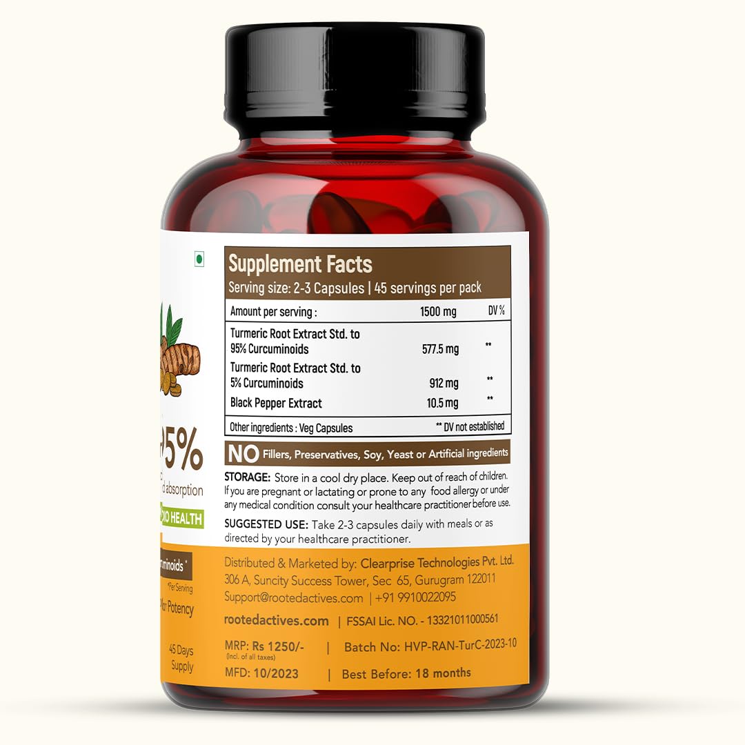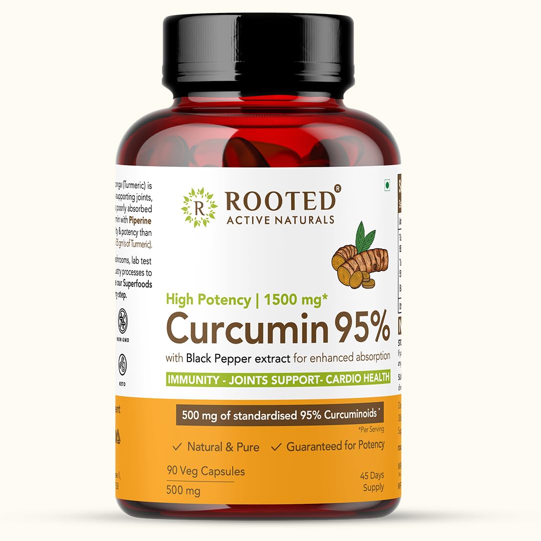 Rooted Actives Curcumin Capsules (95%) With Black Pepper Extract | For Immunity Joints Cardio Health | 90 Veg Capsules 500 Mg