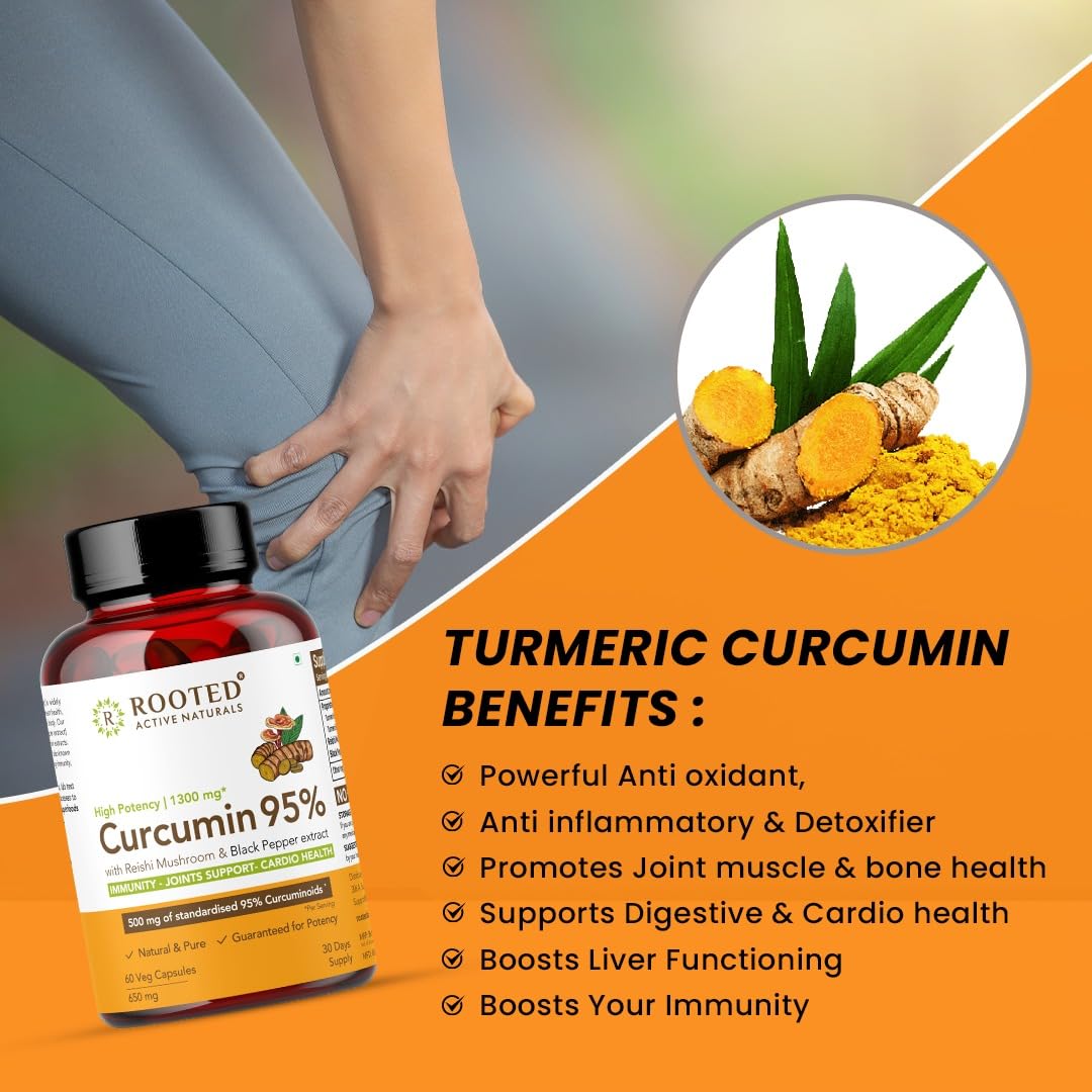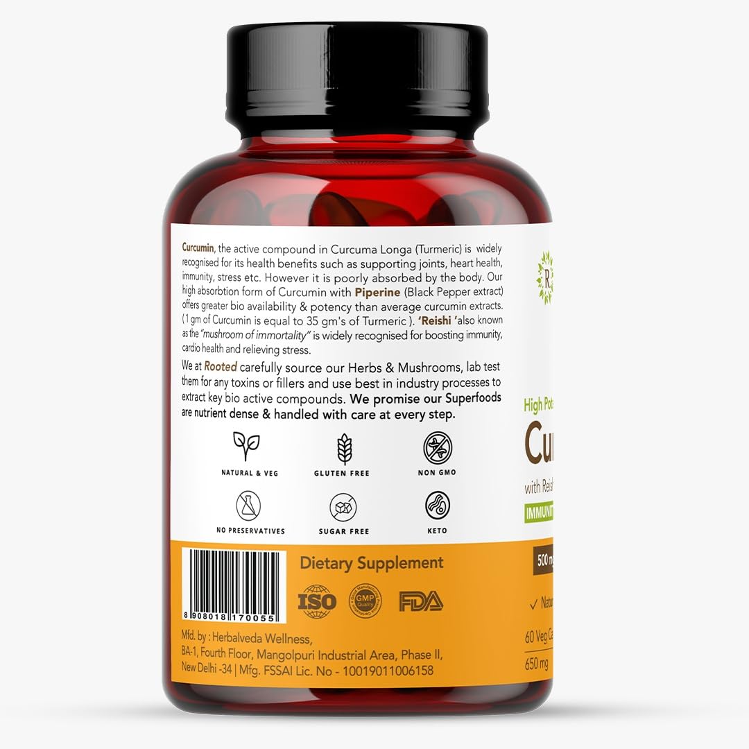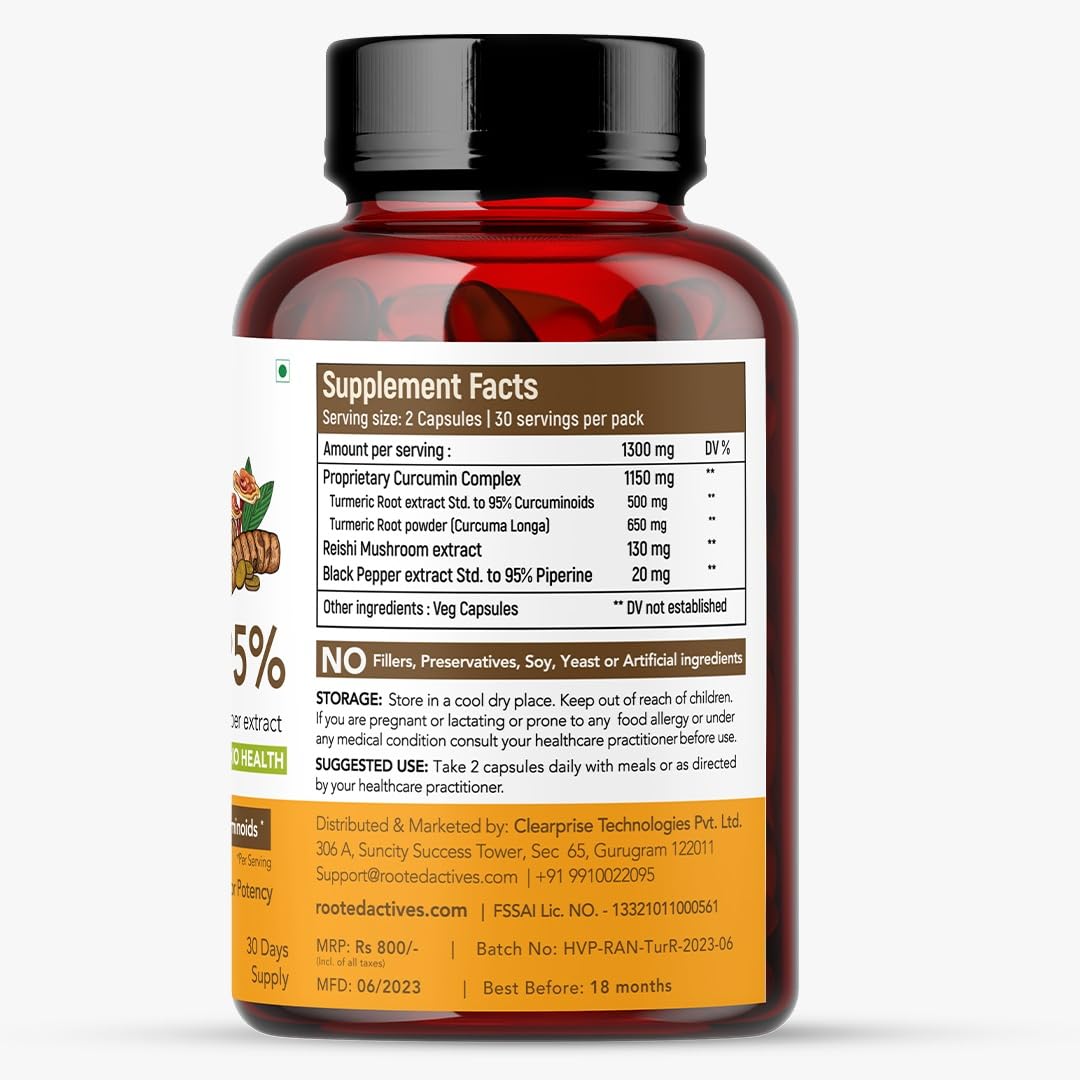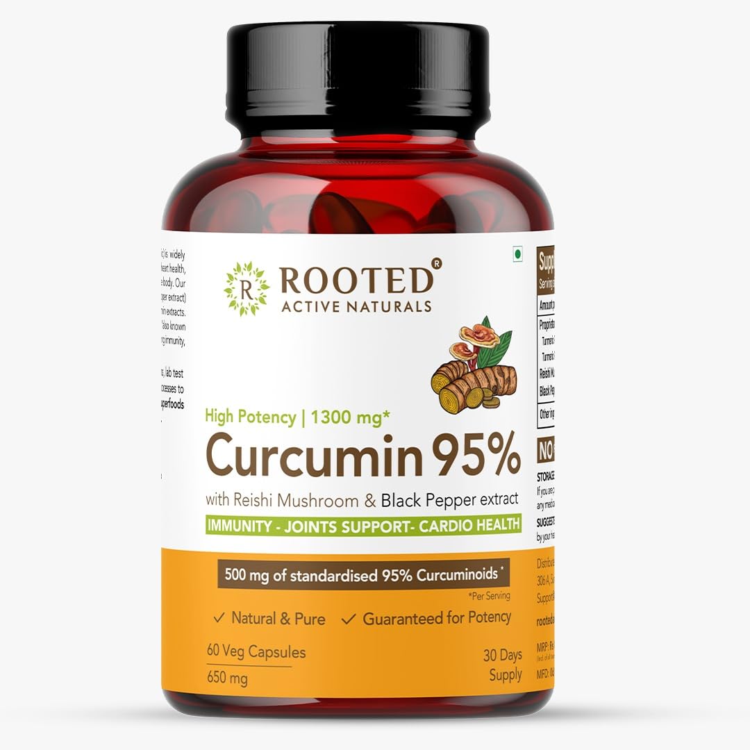 Rooted Actives Curcumin Capsules (95%) Reishi & Black Pepper Extract (For Better Absorbtion) 1300Mg | For Immunity Joints Cardio Health | 60 Veg Capsules 650 Mg Each