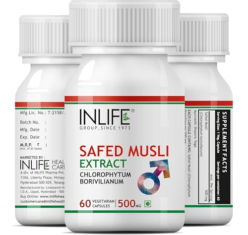 INLIFE Safed Musli contains safe and all natural ingredient and is manufactured to Quality standards. It is made available to give you its full benefit in sufficient and substantial amount that is mostly recommended for male health including. For optimal results take 1 capsule twice daily or as directed by a healthcare professional. Restore your vitality by naturally stimulating the luteinizing hormone to increase energy production recharge your stamina. This one-of-a-kind pill promotes free energy levels with powerful boosters to combat feelings of lethargy and loss of muscle mass while restoring your passion for life. Perfect for people who are looking to increase energy without sticking a needle in their butt. Our product contains the most natural and effective formulation of trusted natural ingredients that are carefully processed and manufactured in a GMP certified manufacturing facility so you can be sure that you're safe. Vegan and vegetarian friendly-INLIFE Safed Musli veg. capsules is produced in gluten-free capsules and contains no artificial ingredients. Other benefits include enhancing hemoglobin levels and heart functions works as an excellent purifying and rejuvenating agent helps aid digestion and prevents constipation and arrest growth of unfriendly micro-organisms. Consider ordering one bottle for yourself and another for a friend or loved one. Keep each other motivated and reach your goals together and more quickly. INLIFE Healthcare stands by every quality product they make. We manufacture only premium and extra pure but high potency vitamins capsules pills tablets powders multivitamins supplements and natural herbal skin & personal care products for men women and children. Check INLIFE Healthcare out today!