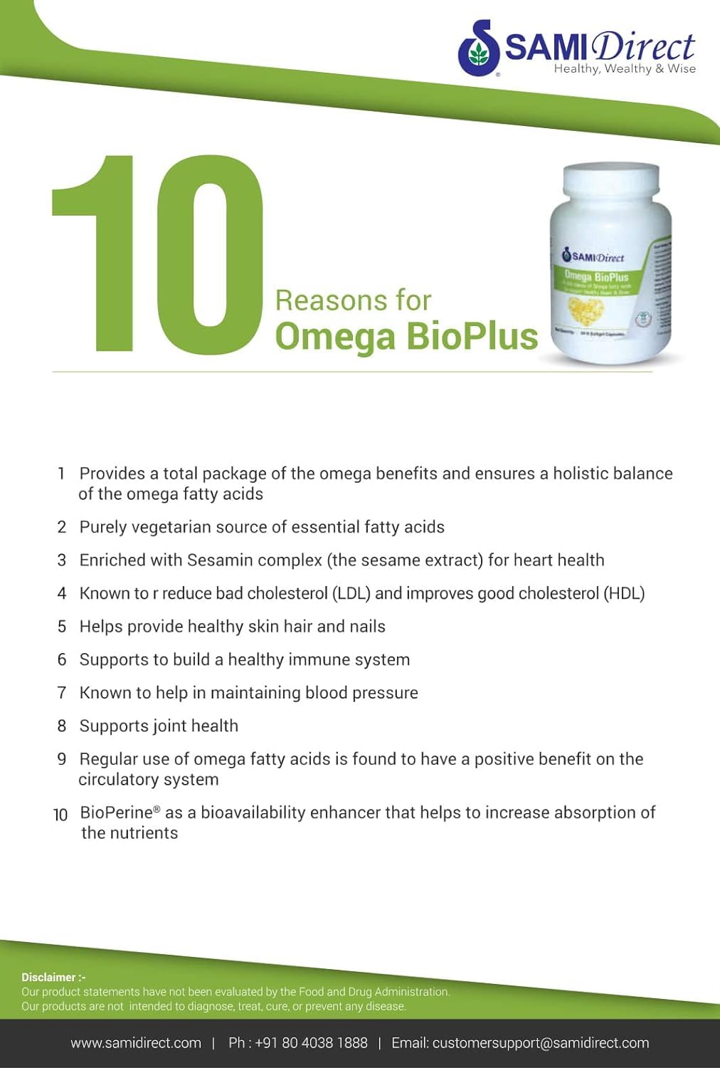 Omega BioPlus is a nutritional supplement with a unique blend of natural vegetable sourced Omega-3 6 and 9 fatty acids. It provides the natural essential fatty acids that our body requires. The fatty acids composition is combined with sesame oil antioxidants and a bioavailability enhancer BioPerine. Omega fatty acids are a health requirement for every man woman and child young and old as they form crucial building blocks to maintain a healthy body. Essential fatty acids are required for energy production in the body cardiac function health of hair skin and nails hormone production brain function and for the integrity of the very structure of cells.