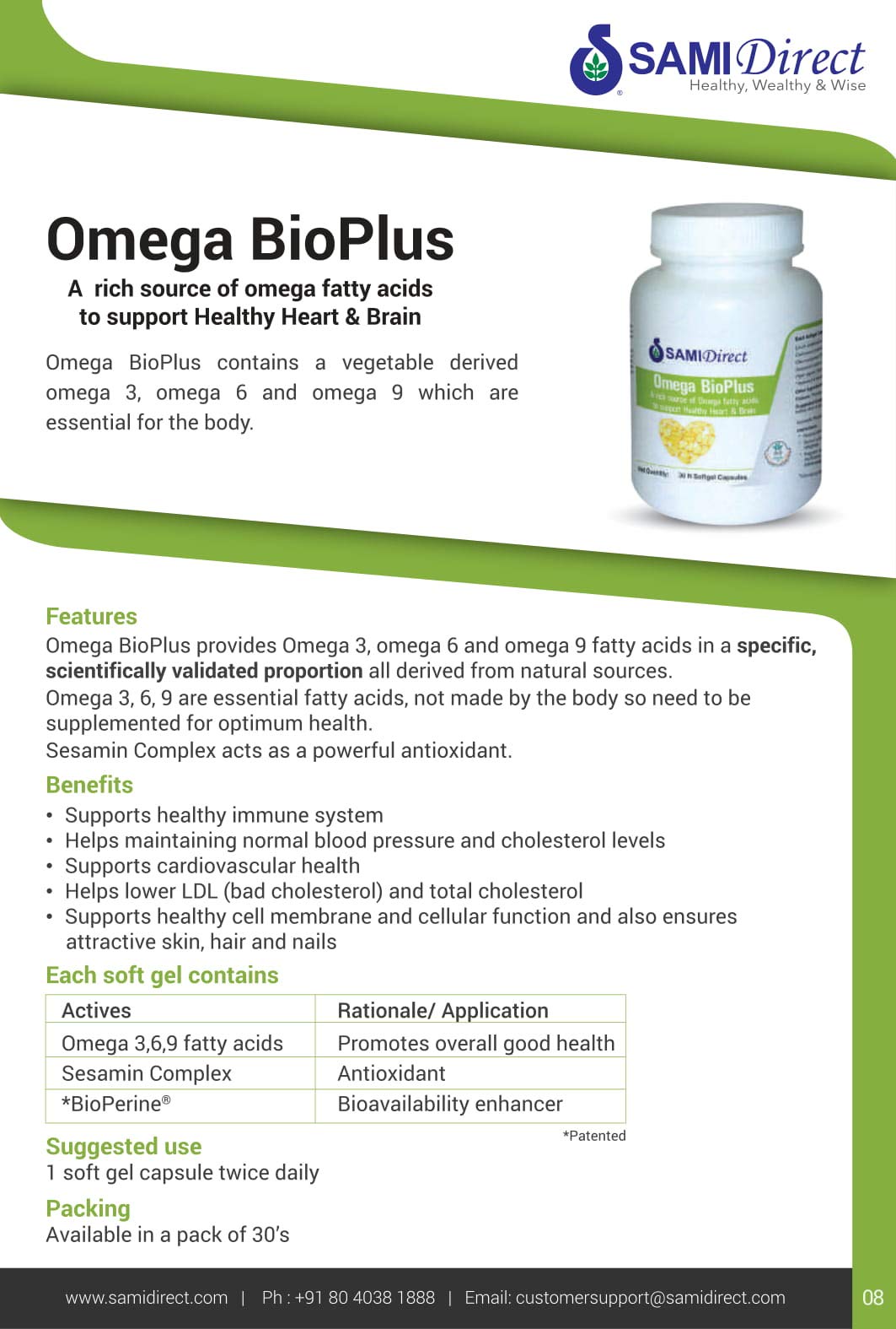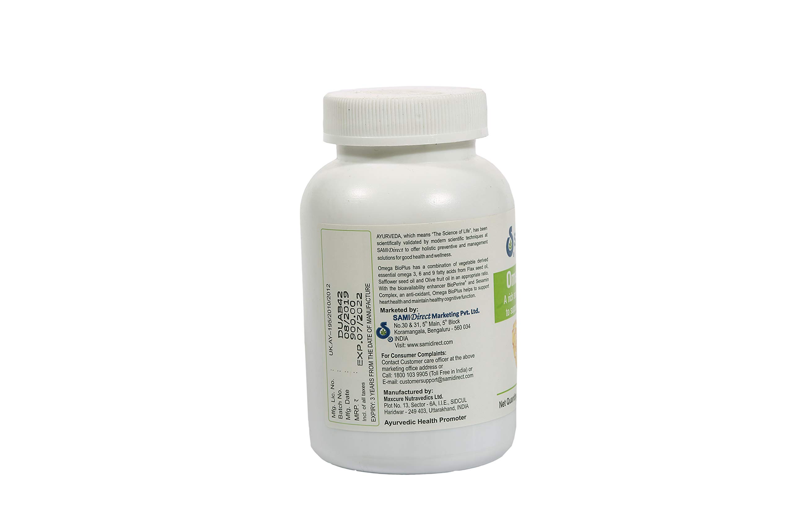 Omega BioPlus is a nutritional supplement with a unique blend of natural vegetable sourced Omega-3 6 and 9 fatty acids. It provides the natural essential fatty acids that our body requires. The fatty acids composition is combined with sesame oil antioxidants and a bioavailability enhancer BioPerine.