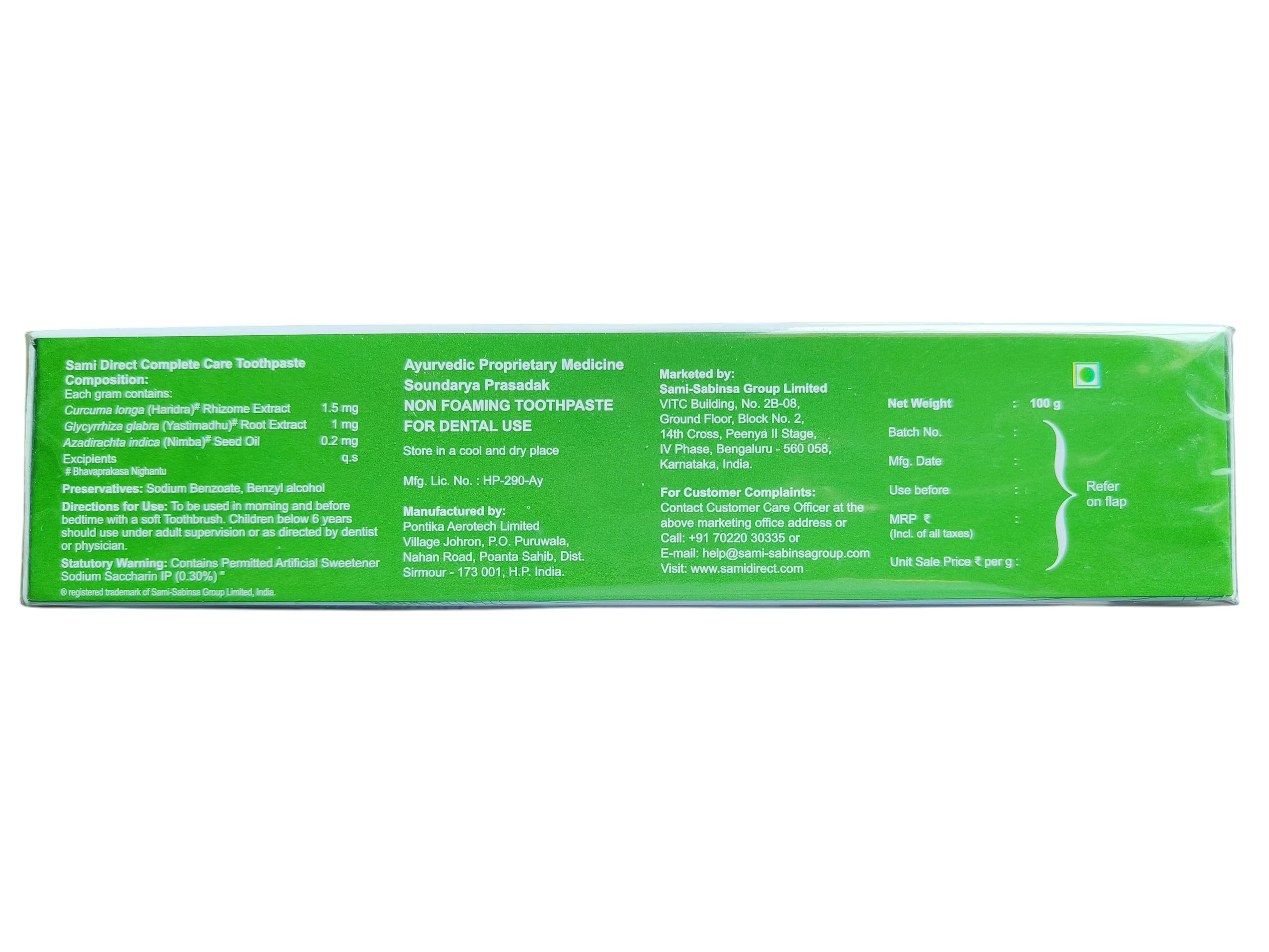 Discover comprehensive oral care with SAMI Direct Complete Care Toothpaste a fluoride-free herbal formulation designed for your daily dental needs. Each pack contains four 100g tubes offering excellent value for your family. This toothpaste is specially formulated to promote white and strong teeth maintain healthy gums ensure fresh breath and help prevent tooth decay. The herbal-based formula provides a natural approach to oral hygiene while being gentle on your teeth and gums. The convenient 100g size is perfect for both individual use and family sharing. Whether you're looking to maintain oral hygiene or enhance your smile this complete care toothpaste offers a holistic solution for your dental care routine. Experience the confidence that comes with thorough oral care and make this toothpaste an essential part of your daily regimen.