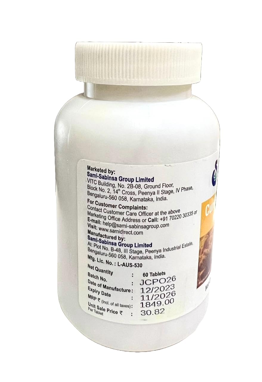 Sami Direct's Curcumin C³ Power is a dietary supplement formulated to harness the health benefits of curcuminoids the active compounds found in turmeric. This product is designed to support overall wellness through its potent antioxidant and anti-inflammatory properties. Key Features: Patented Formula: Curcumin C³ Power is a patented and clinically evaluated "Bio-protectant" composition comprising three curcuminoids: curcumin demethoxycurcumin and bisdemethoxycurcumin. Enhanced Absorption: The inclusion of BioPerine (black pepper extract) enhances the bioavailability of curcuminoids ensuring better absorption in the body. Antioxidant Support: Curcuminoids are powerful antioxidants that help neutralize free radicals supporting cellular health and overall wellness. Anti-Inflammatory Benefits: Traditionally used in Ayurveda curcuminoids assist in managing inflammation and may help alleviate discomfort associated with conditions like sore throats and arthritis. Dosage: The recommended dosage is one tablet in the morning and one at night after meals taken with water or warm milk. It's advisable to consult with a healthcare professional before starting any new supplement regimen. Packaging: Each bottle contains 60 tablets with each tablet delivering 525 mg of the Curcumin C³ Power blend. Safety Information: Store out of reach of children. Pregnant or lactating women and individuals with kidney disorders should consult a healthcare professional before use. Do not exceed the recommended daily dosage. This product is not intended to replace a varied diet. Store in a cool dry place away from direct sunlight; do not refrigerate. Incorporating Sami Direct's Curcumin C³ Power into your daily routine may offer support for overall health particularly in managing inflammation and providing antioxidant protection.