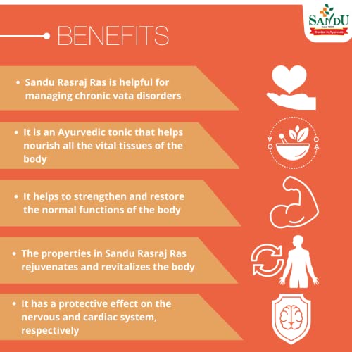 p Sandu Rasaraj Ras is an ayurvedic medicine very effective in the treatment of chronic neuro-muscular diseases caused by Vata imbalance. /p p Sandu Rasaraj Ras is an excellent nerve and cardiac tonic. It is useful in various diseases of brain and heart. /p p Sandu Rasaraj ras benefits in paralysis facial palsy hearing defects dizziness etc. /p p Sandu Rasaraj Ras strengthens nerves and muscles and helps to restore functions of blood vessels and nerves in stroke patients. /p