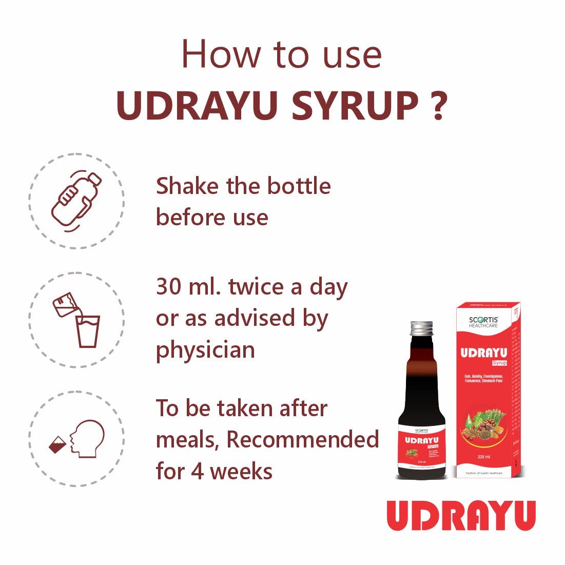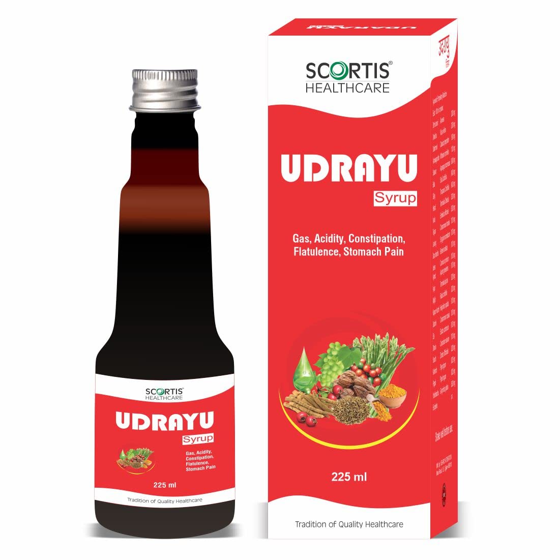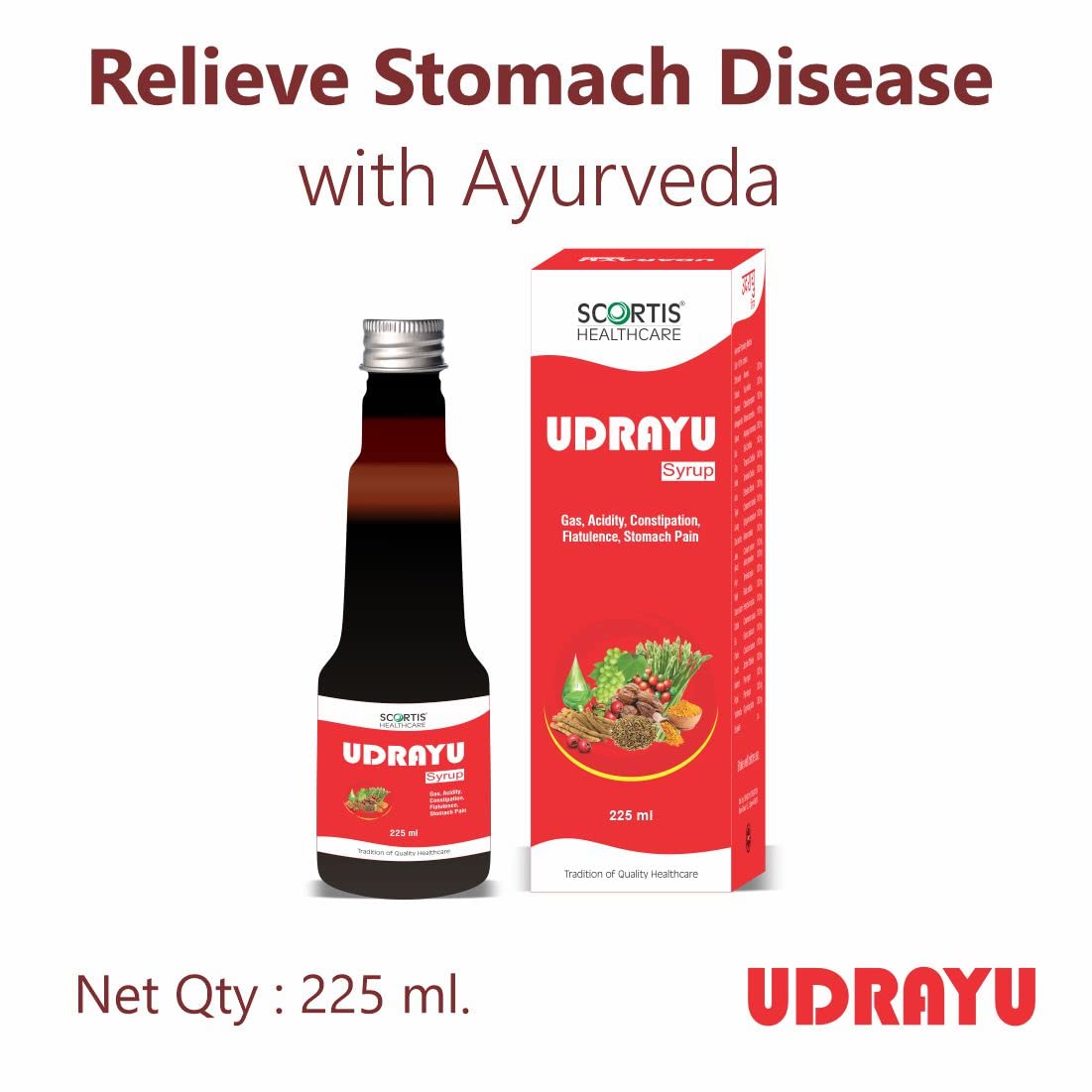 Udrayu is a digestive tonic and can improve digestion and reduce digestive diseases. after it is effective for acidity gas flatulence and abdominal distension heaviness in the abdomen chronic constipation and abdominal pain. Prevents all digestive problems like gas acidity constipation flatulence stomach pain feeling of heaviness in the abdomen indigestion. On regular usage builds immunity and strengthens the digestive system. Digestive Carminative and restorative tonic improves Appetite Help in convalescence after a prolonged illness. Scortis Udramrut syrup which helps to prevent all digestive problem such as gas acidity constipation flatulence stomach pain feeling of heaviness in the abdomen indigestion builds immunity and strengthens the digestive system. Udaramrut syrup is made with the right blend of probiotics and special Ayurvedic herbs stimulate appetite and help digestion reduces stomach upset and nausea aids in overgrowth and abdominal pain.