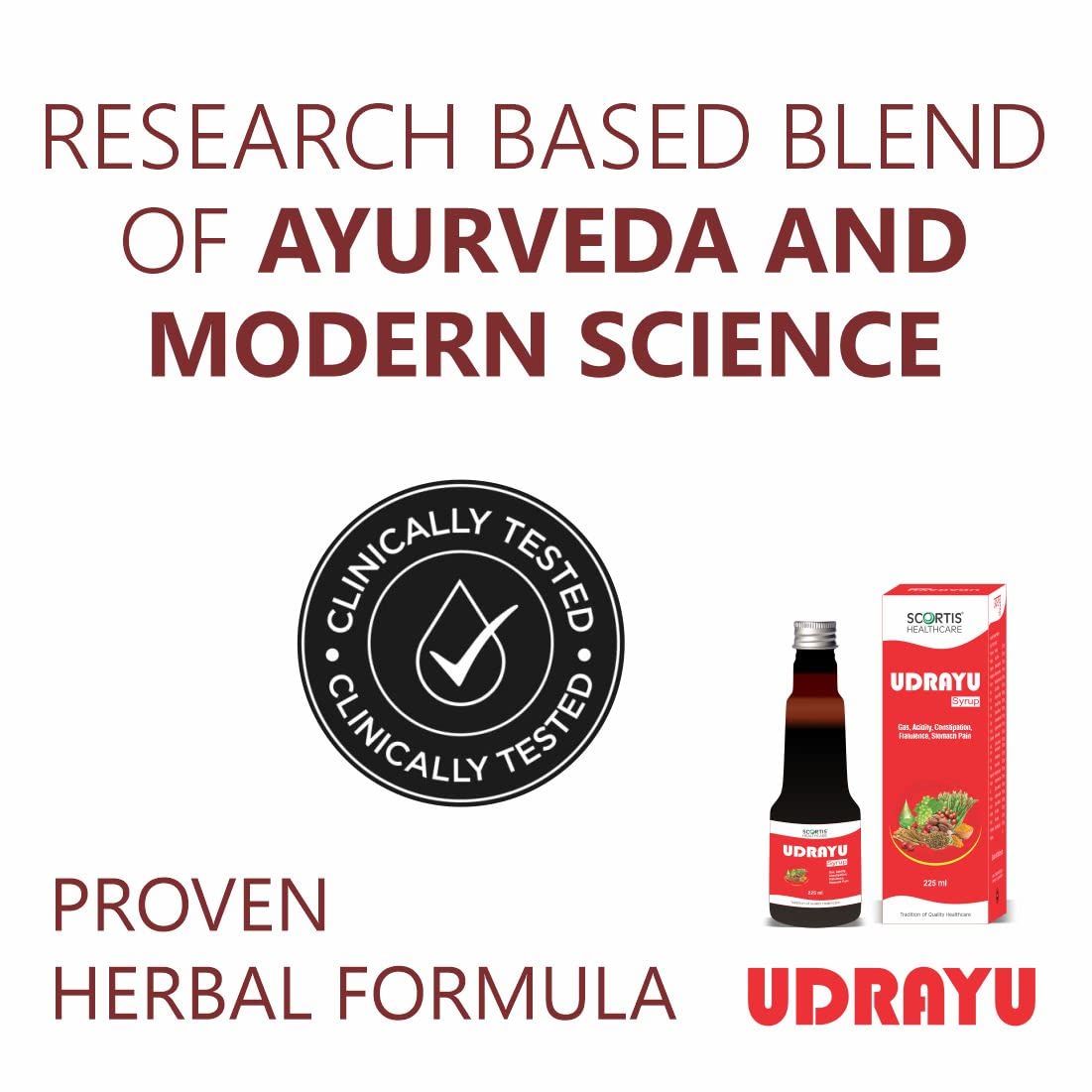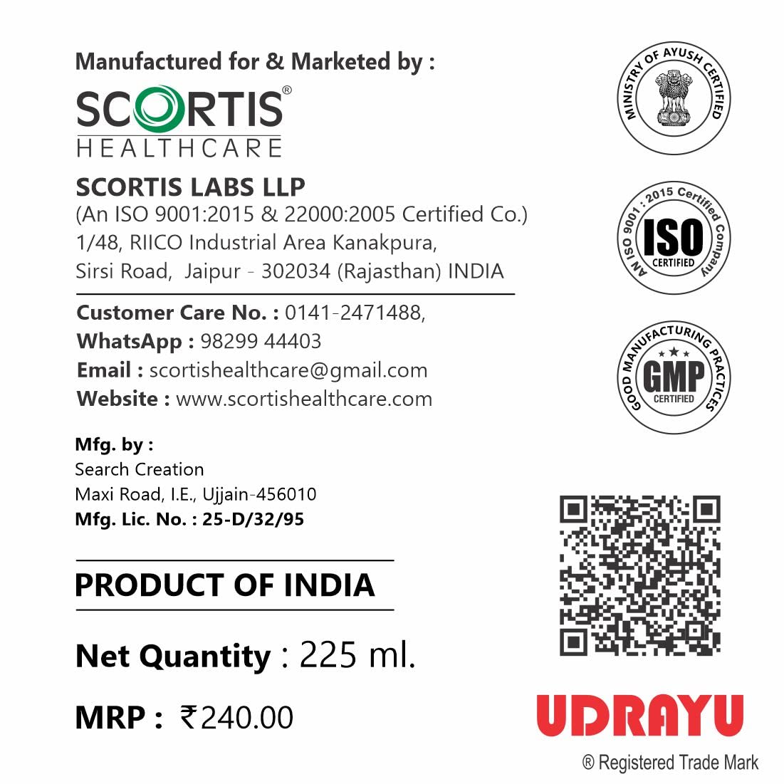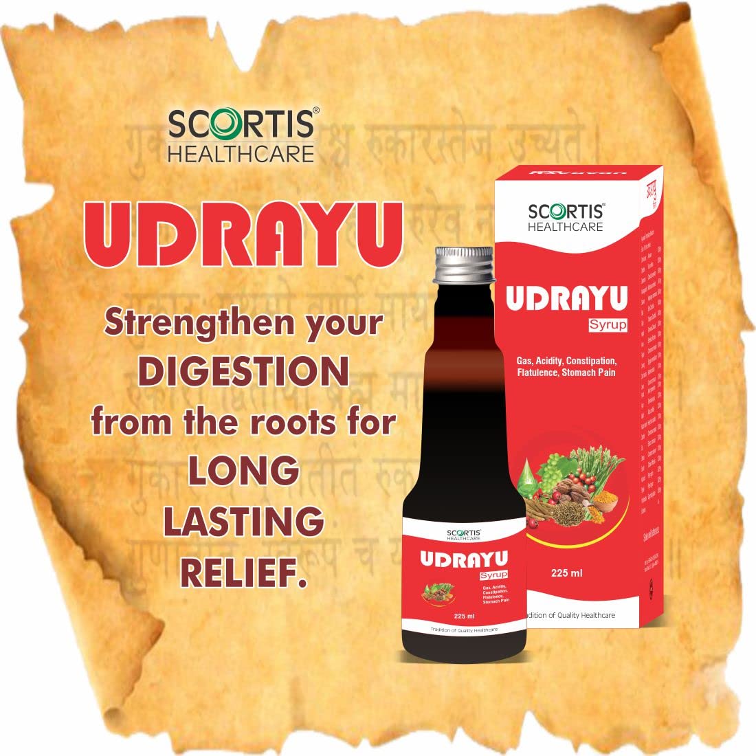 Udrayu is a digestive tonic and can improve digestion and reduce digestive diseases. after it is effective for acidity gas flatulence and abdominal distension heaviness in the abdomen chronic constipation and abdominal pain. Prevents all digestive problems like gas acidity constipation flatulence stomach pain feeling of heaviness in the abdomen indigestion. On regular usage builds immunity and strengthens the digestive system. Digestive Carminative and restorative tonic improves Appetite Help in convalescence after a prolonged illness. Scortis Udramrut syrup which helps to prevent all digestive problem such as gas acidity constipation flatulence stomach pain feeling of heaviness in the abdomen indigestion builds immunity and strengthens the digestive system. Udaramrut syrup is made with the right blend of probiotics and special Ayurvedic herbs stimulate appetite and help digestion reduces stomach upset and nausea aids in overgrowth and abdominal pain.