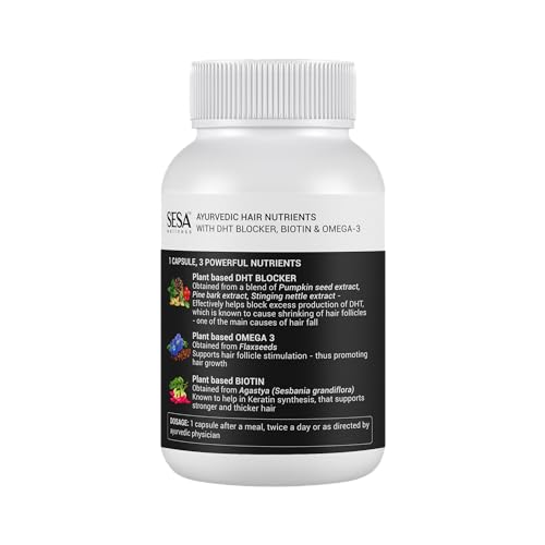 100% VEG PLANT-BASED NUTRIENTS: Sesa Hair Nutrients Capsules are 100% vegetarian and are made with plant-based ingredients viz DHT blocker obtained from a blend of PUMPKIN SEED PINE BARK & STINGING NETTLE extract; Omega-3 obtained from FLAXSEEDS and Bioti