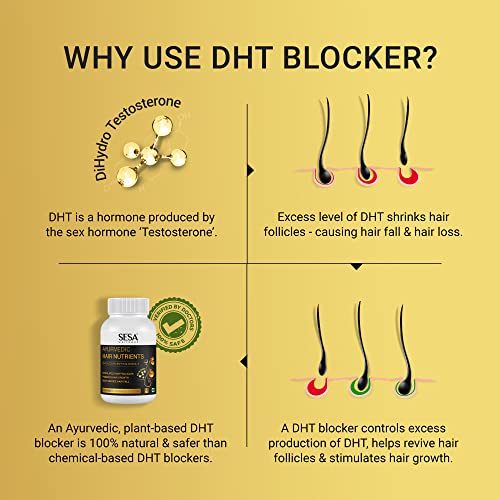 BLOCKS EXCESS DHT PRODUCTION: Sesa Hair Nutrient Capsule is a plant-based DHT blocker that helps block the EXCESS production of DHT which is known to cause the shrinking of hair follicles leading to hair fall.
