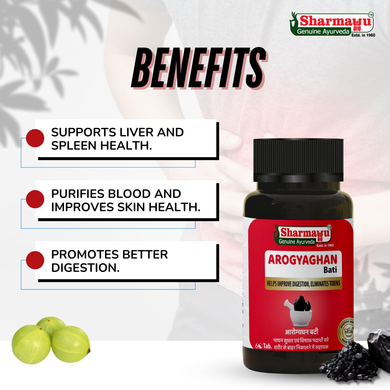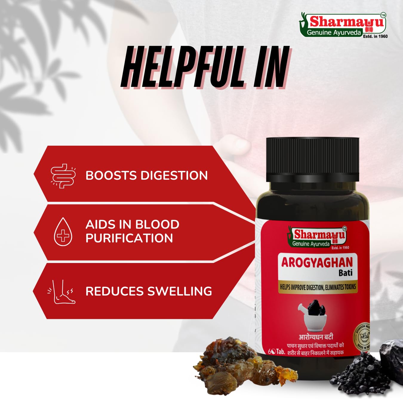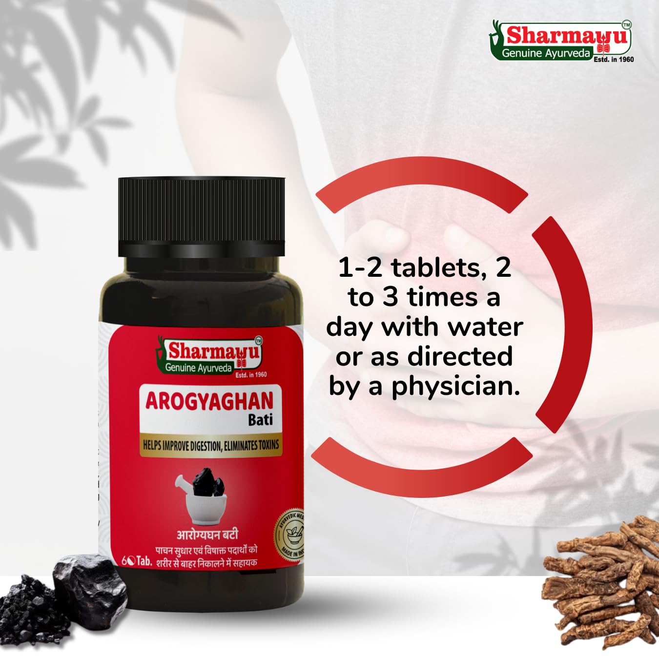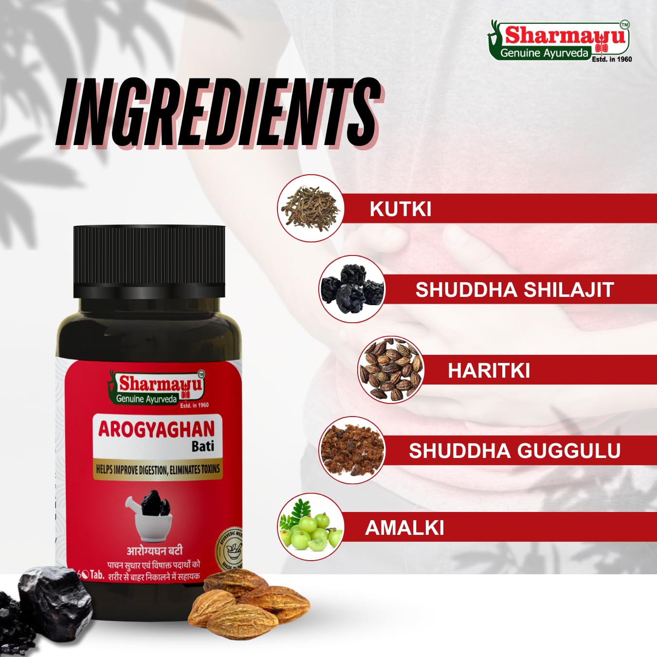 Sharmayu Arogyaghan Bati (Arogyavardhini Bati) is a potent Ayurvedic formulation that promotes overall digestive health detoxifies the body and supports liver and spleen function. Enriched with time-tested herbs like Kutki Triphala Neem and Shuddha Shilajit this supplement aids in relieving constipation acidity bloating and abdominal discomfort. It also purifies the blood and helps manage obesity skin disorders anemia and sluggish metabolism. Its detoxifying action supports liver rejuvenation and improves overall vitality. Ideal for those seeking a natural solution for digestion weight control and skin wellness. Made from 100% Ayurvedic ingredients this tablet is safe for regular use and manufactured in a GMP and ISO-certified facility. Suitable for adults of all ages.