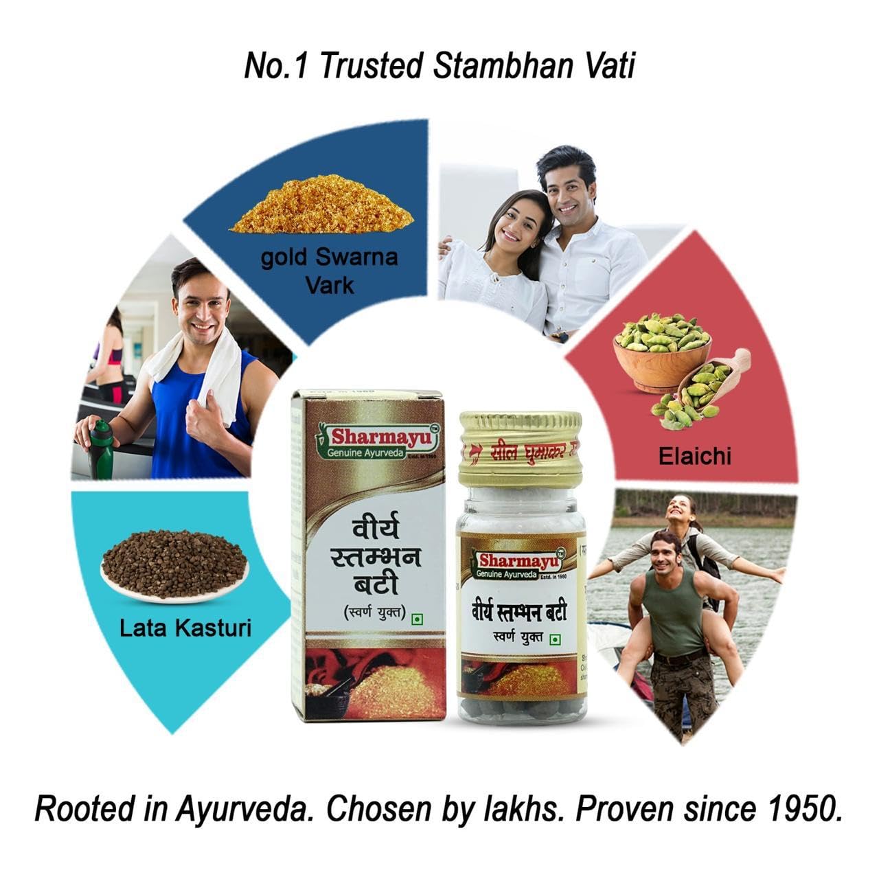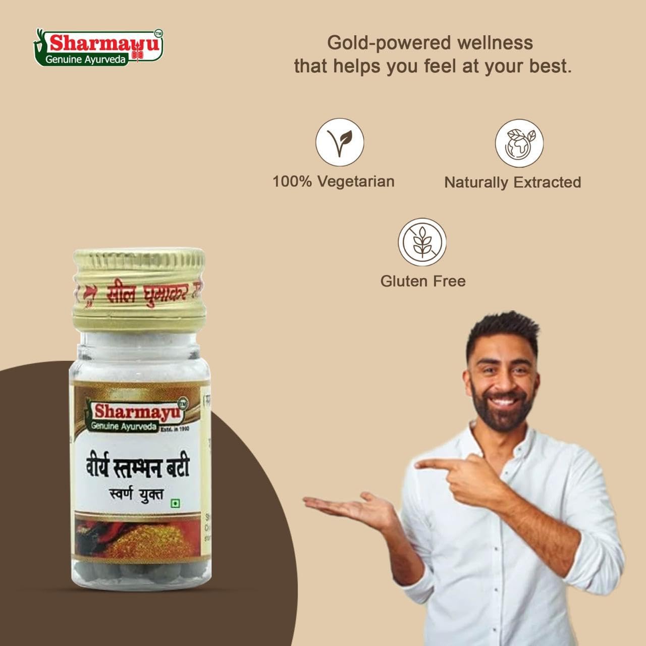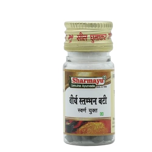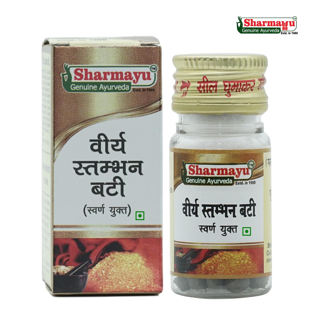 Sharmayu Viraya Stambhan Bati (Swarna Yukta) is a traditional Ayurvedic supplement crafted to support overall wellness and vitality. It is prepared using a unique blend of herbs such as Lata Kasturi Elaichi Jatamansi and other natural ingredients following classical Ayurvedic formulations. This supplement contains Swarna Vark (gold leaf) which has long been used in Ayurveda for enhancing the effectiveness of herbal combinations. Suitable for those seeking a natural daily supplement for maintaining strength and energy.