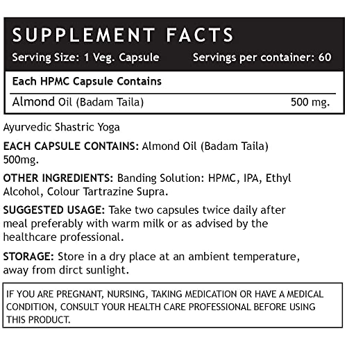 Being a rich source of health benefiting nutrients such as biotin vitamins and minerals such as manganese copper phosphorus and magnesium almonds are considered one of the healthiest foods of the world. Almond oil is extracted from dried sweet almonds. It is used extensively in the cosmetic industry as an active ingredient in beauty skin and hair care products. It's deep moisturizing and absorption property makes it ideal for all skin types. It works as a natural sunscreen. It is a rich source of vitamin E - a powerful antioxidant that fights free radical damage. It supplies necessary nutrients to the hair. The benefits of Almond oil are not limited to skin and hair only. The monounsaturated fats also help in weight management. Manganese copper and Riboflavin (Vitamin B2) present in almonds promote energy flow. It is natural ayurvedic product. Suggested Usage:Take 1 capsule 2 times daily after meals or as directed by a healthcare professional. Sheltr offers pure Sweet Almond Oil in the form of Liquid Filled Capsules. Advantages of liquid filled capsules over softgels: Contains no plasticizers Improves product stability Low moisture intake Effectively masks taste & odour Band sealing prevents leakages Tamper proof capsules Offers enhanced bio availability One of the main advantages of liquids is that they are absorbed directly by the body without going through break down stages. Active ingredients in liquid form should therefore be absorbed faster than in solid form.