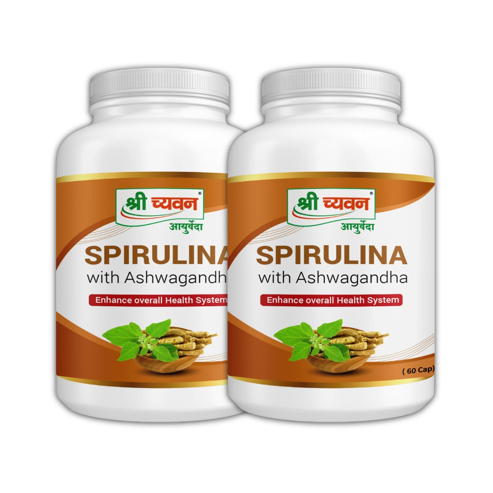 Shri Chyawan Ayurveda Spirulina with Ashwagandha Capsules - Helps Releive Stress Anxiety Regulates Sleep Cycle Controls Cholesterol etc. - 60 Tablets (Pack of 2)