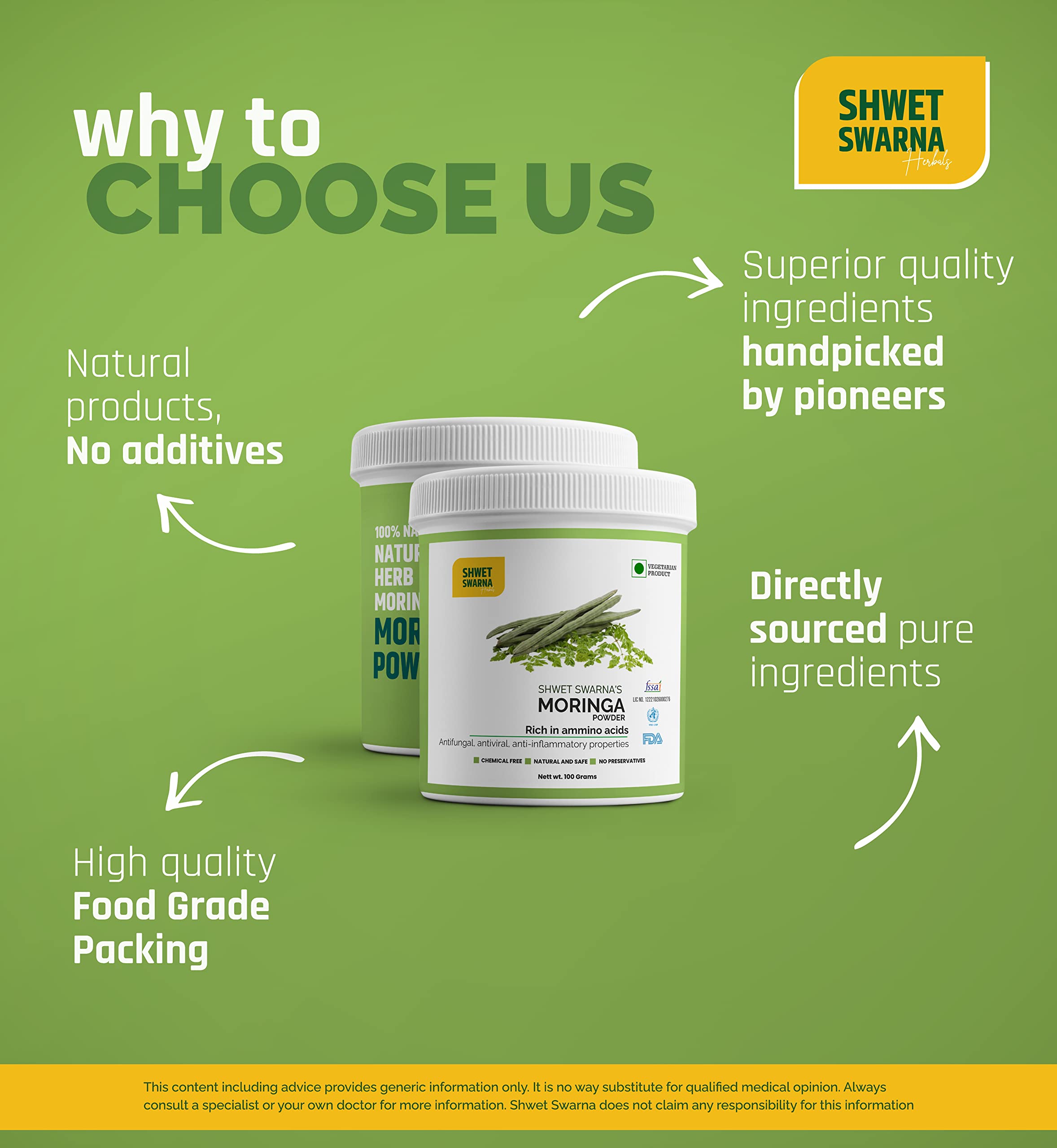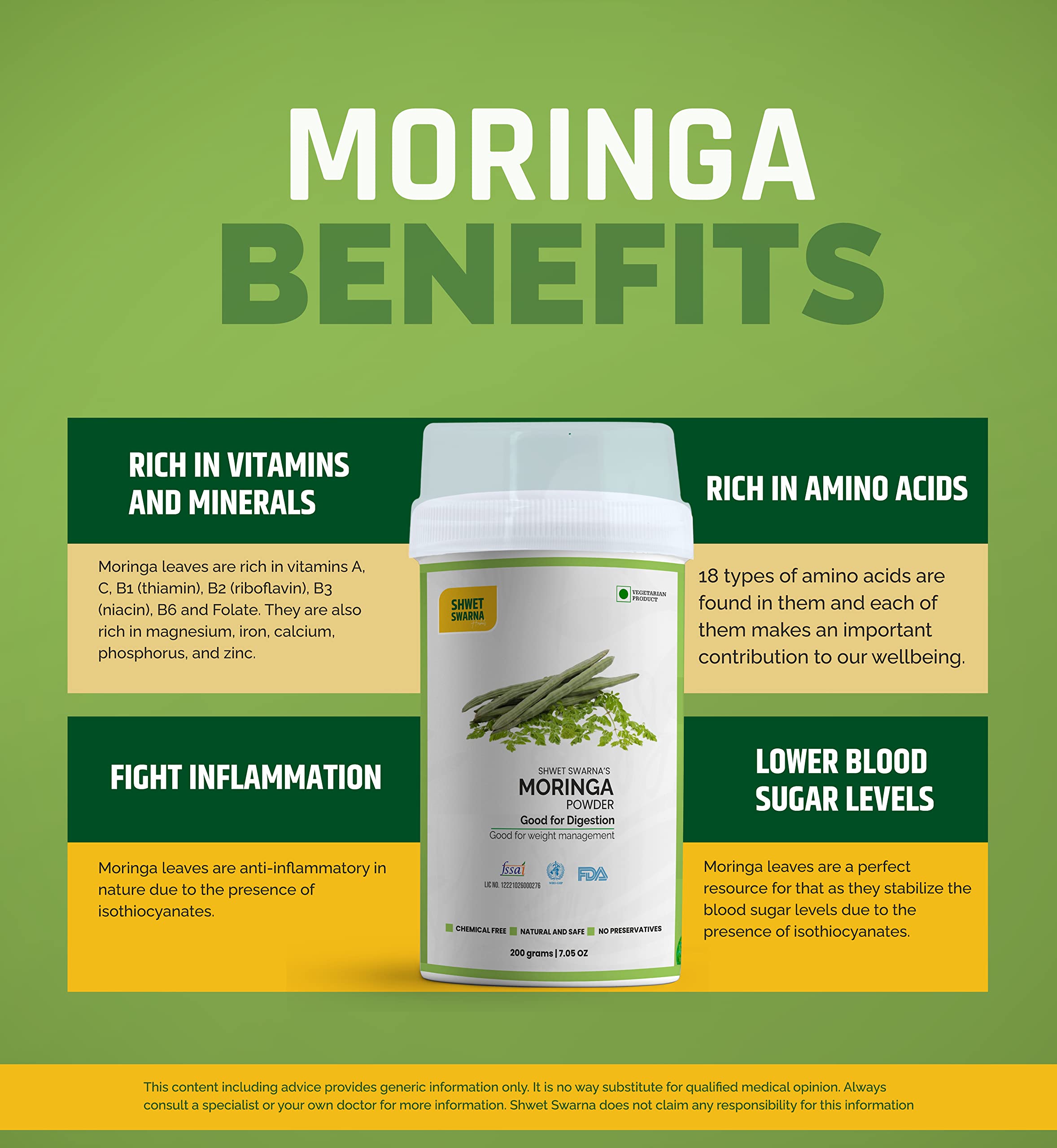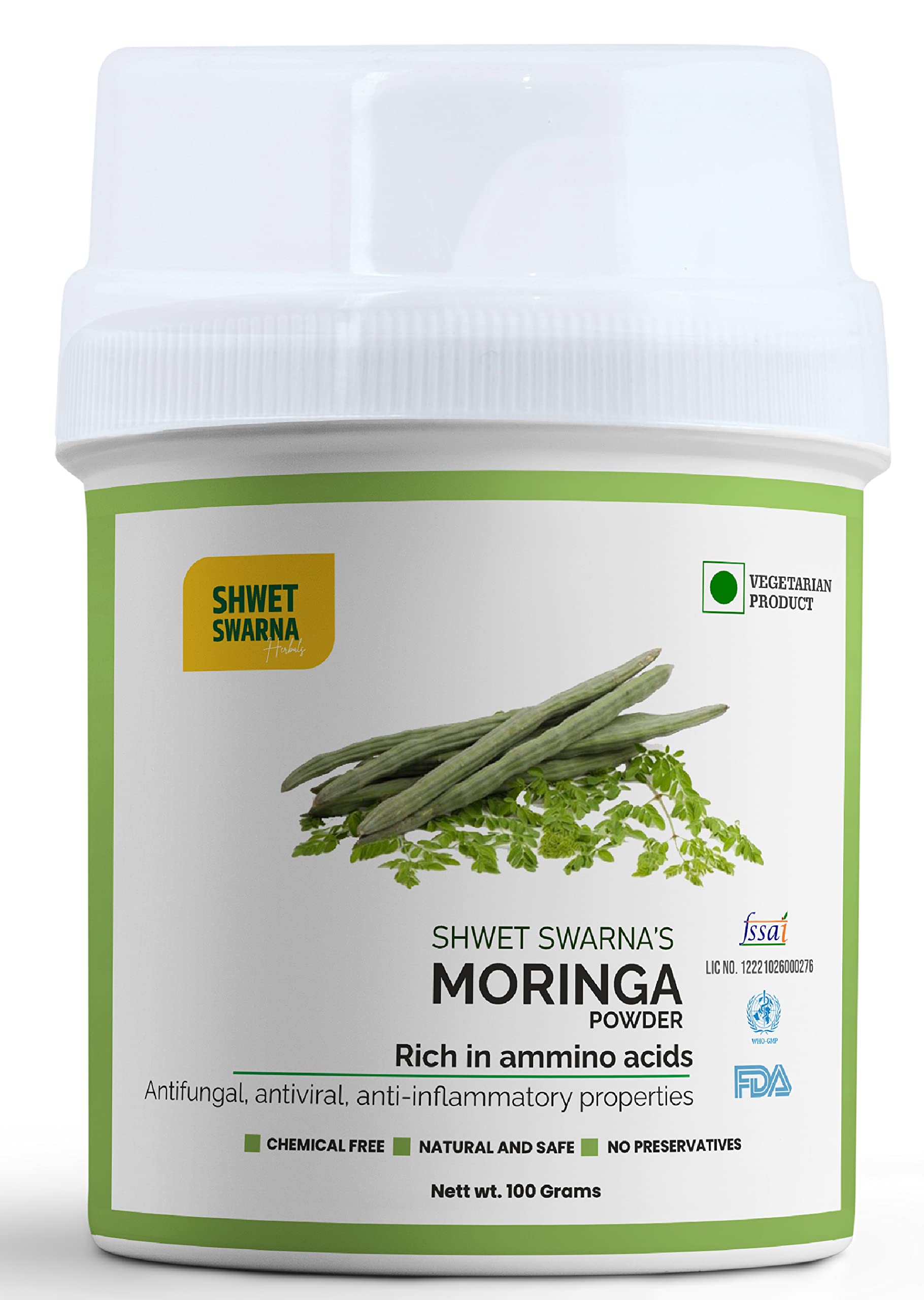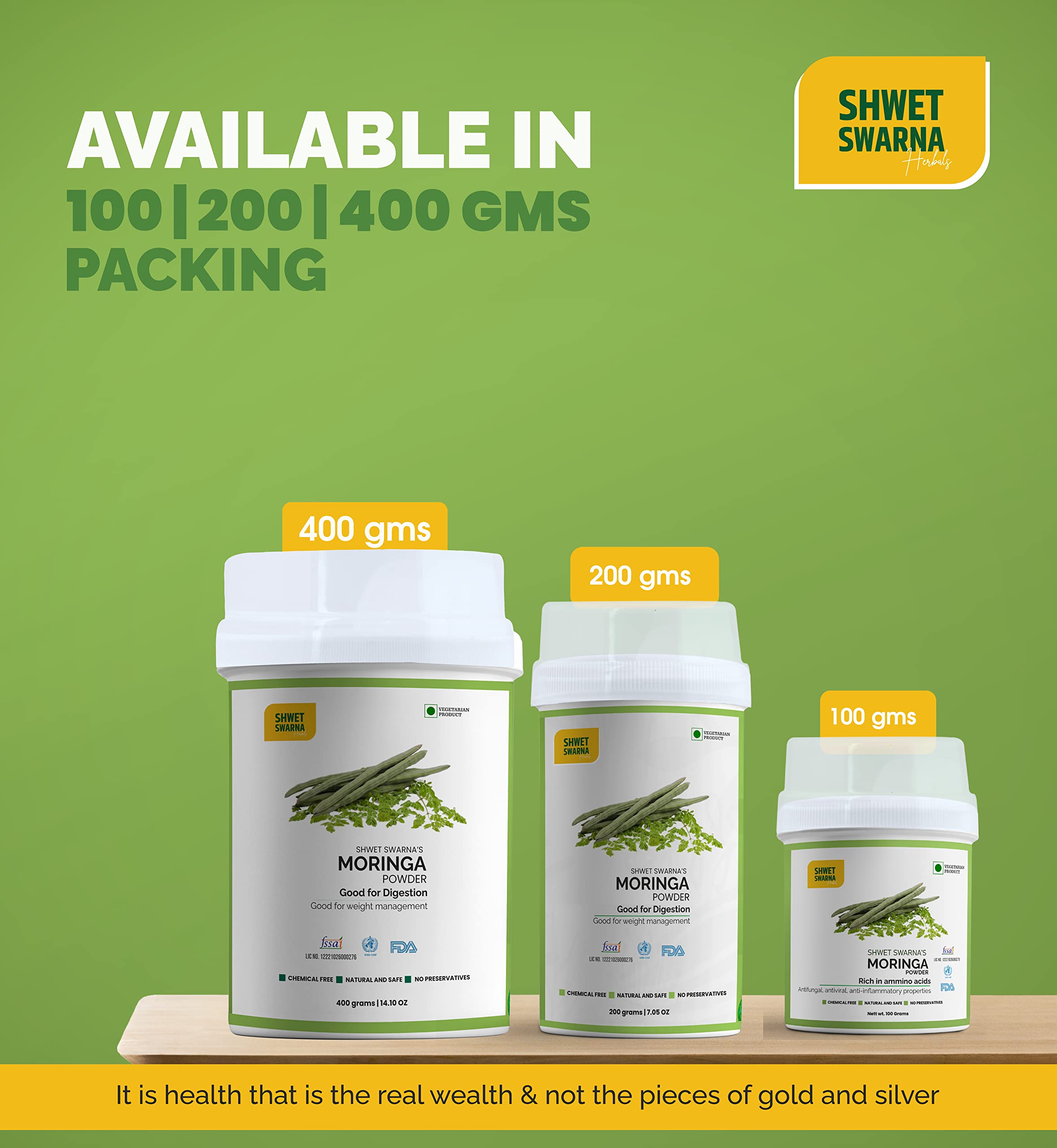 Shwet Swarna's 100% Natural & Organic Moringa Powder is a rich source of vitamins calcium iron minerals and amino acids. It is good for boosting immunity and energy levels. Moringa Powder is a whole food that is easily absorbed and utilized by our body. Rich in minerals like calcium potassium zinc magnesium iron and copper Vitamins like beta-carotene of vita & anti-inflammatory properties.