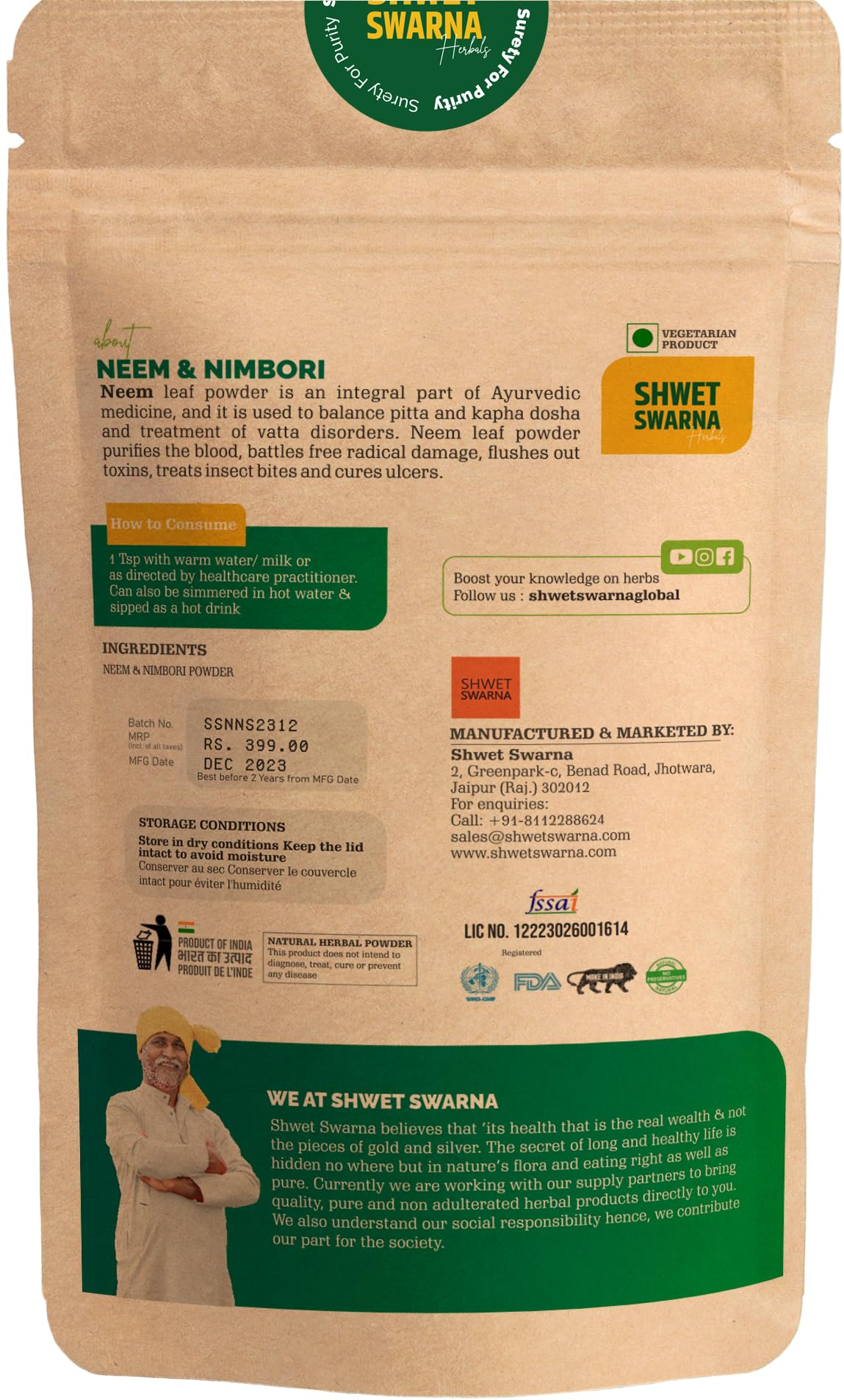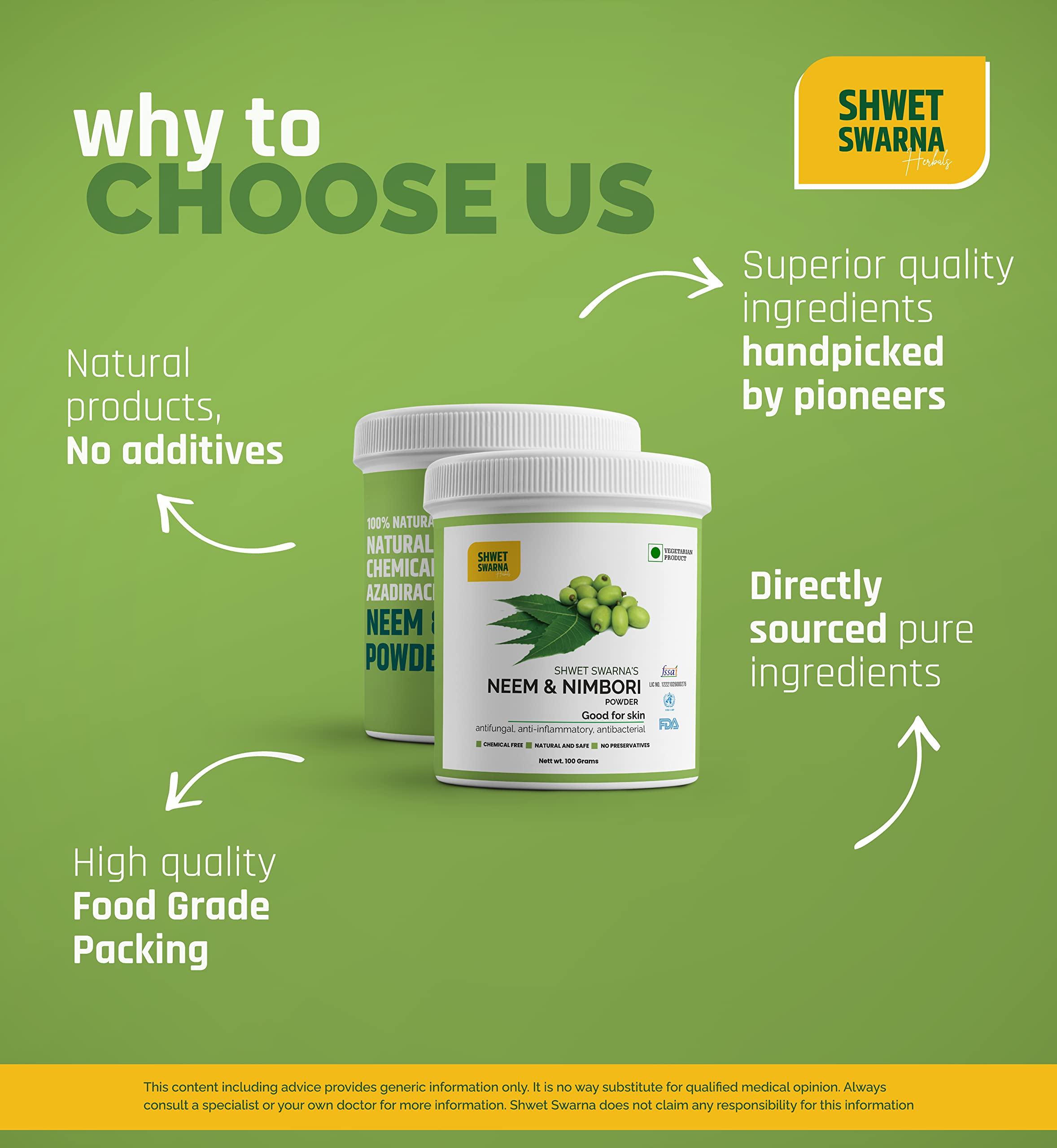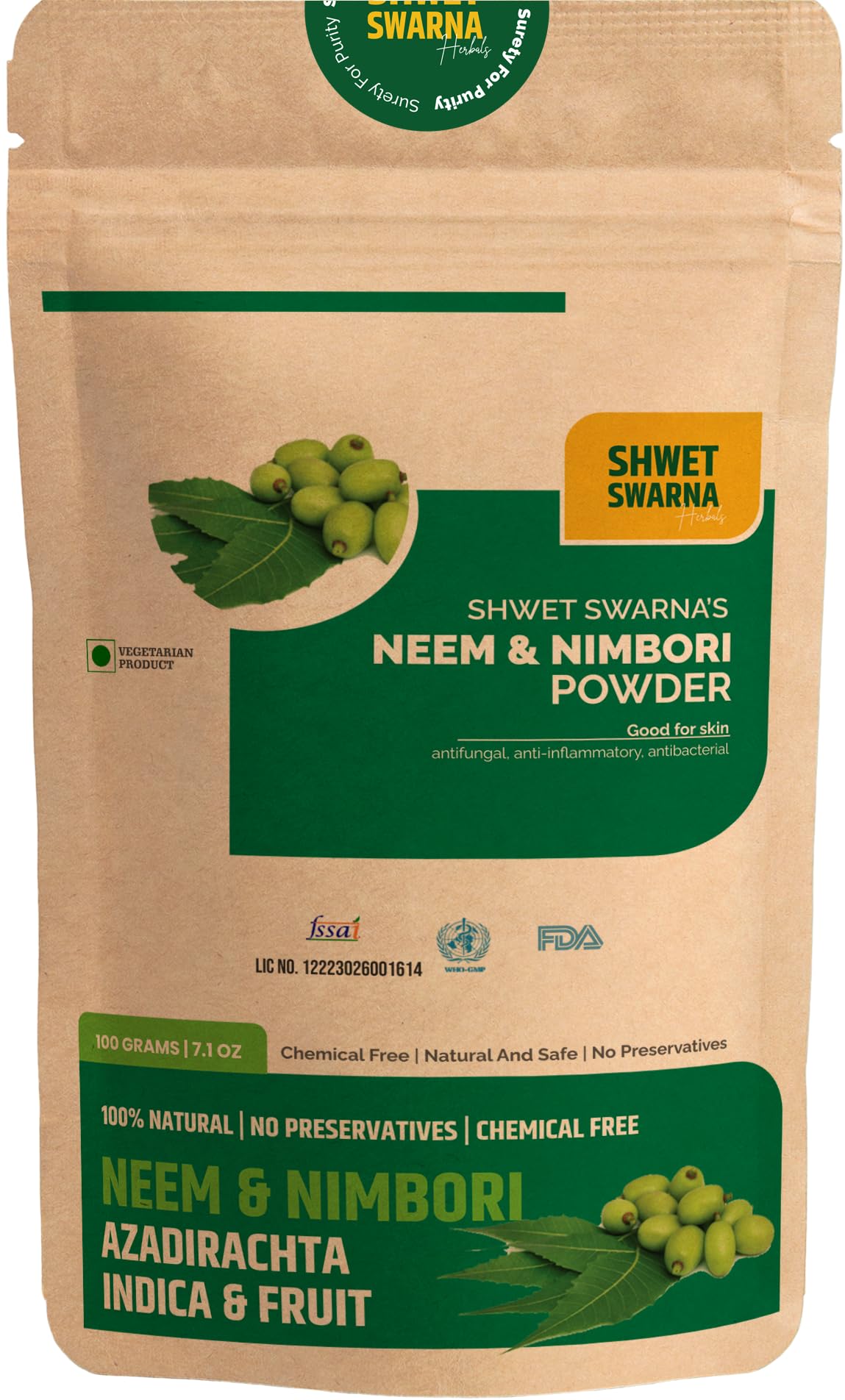 100% Natural & Organic NEEM & NIMBORI (Azadirachta indica & fruit) Powder by Shwet Swarna FSSAI Certified 100 Grams Powder. Herbal Health Supplement Good for arthritis antioxidant anti-inflammatory.