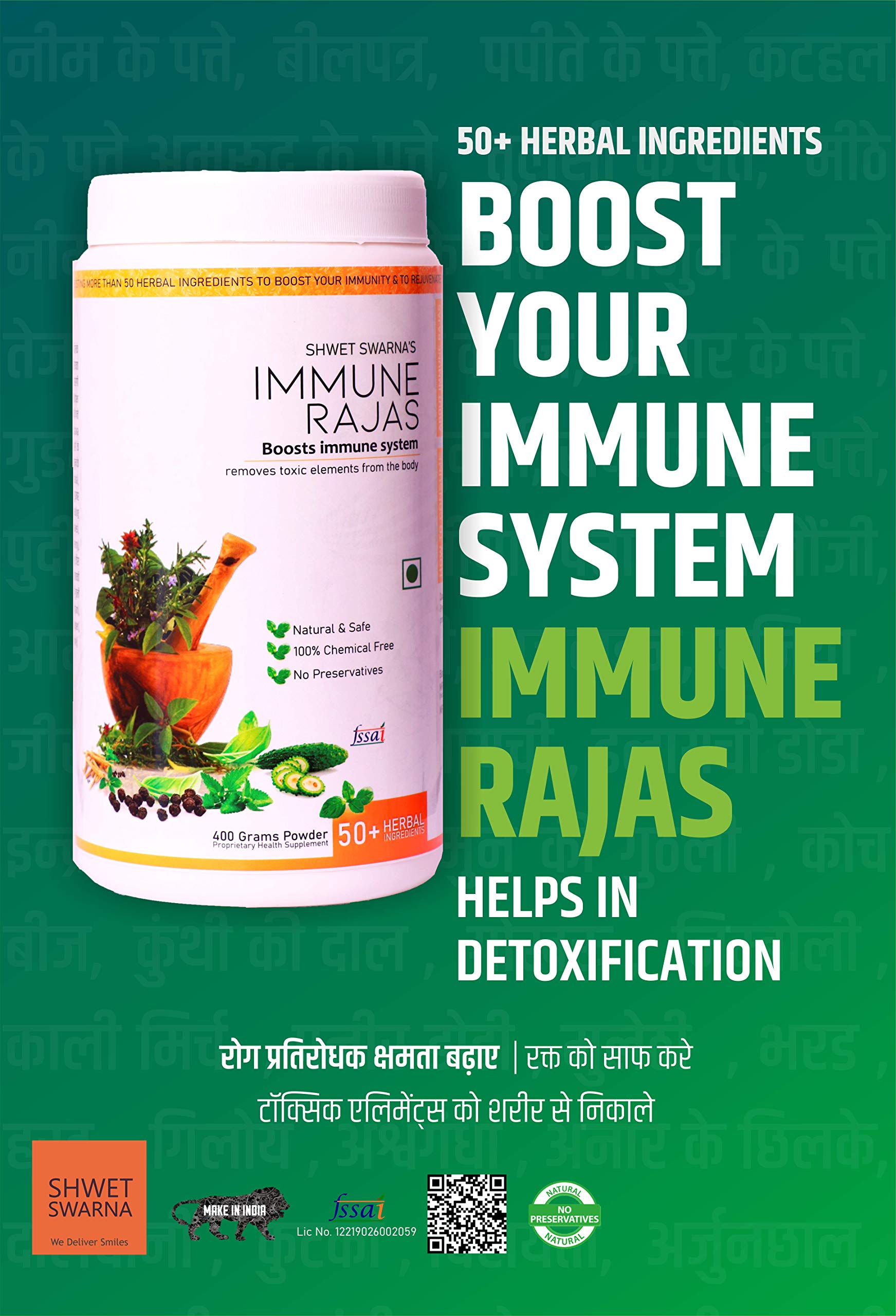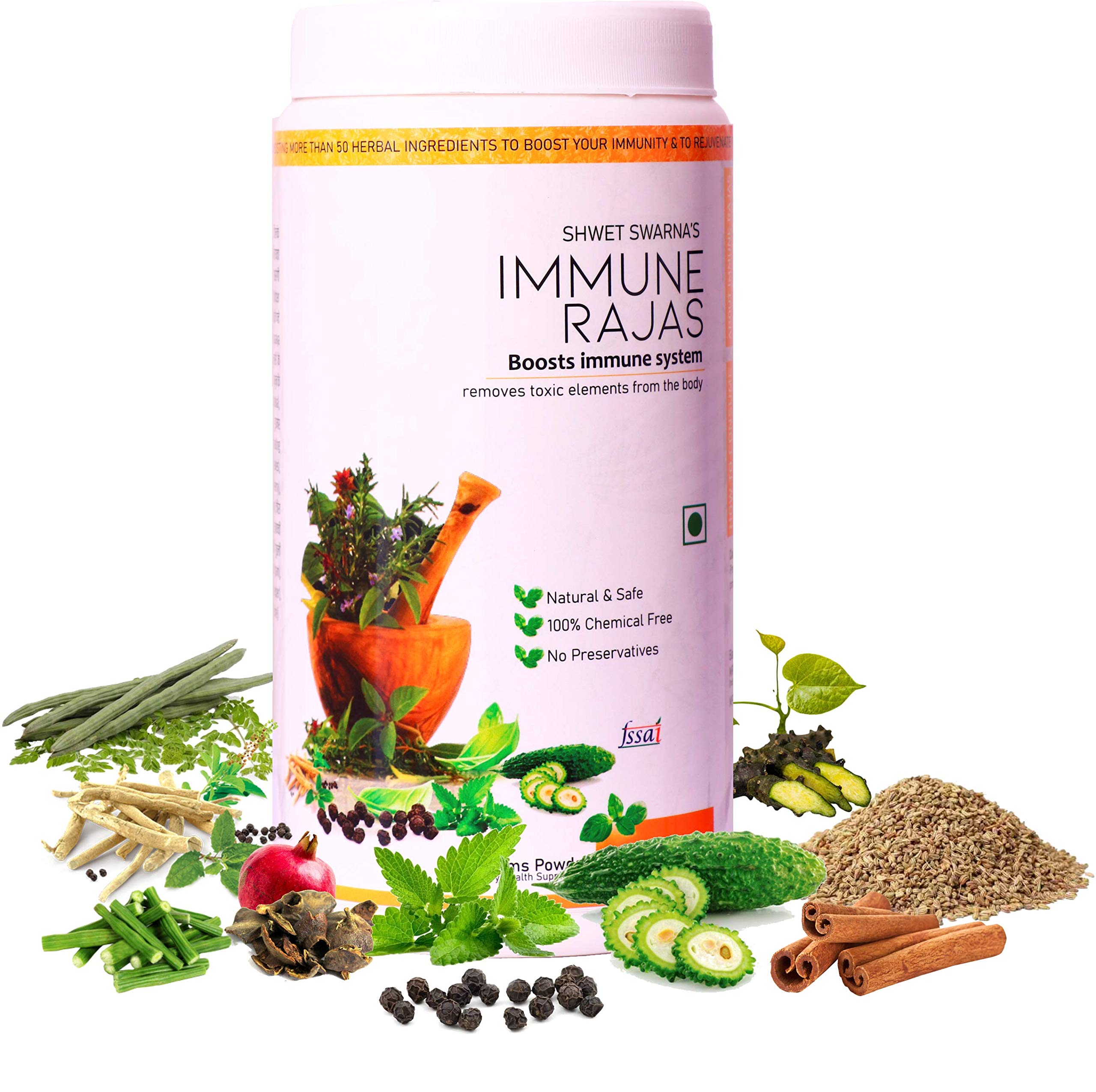 A combination of 50+ Natural Safe and Chemical free ingredients including Tulsi MoringaWhite Musli Black Musli Ashwagandha Giloy Mulethi Arjunchaal Gokhru Dalchini Kali Mirch Gokhru Amla Brahmi Gokhru etc. with no added preservatives Its ingredients are proven to boost the immune system removal of toxic elemets. The ingredients used in the product are safe and are used extensively for home remedies as well. Immune Rajas is a proprietary health supplement not for medicinal use and it does not cure any disease.