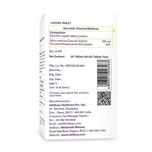 • 100% Pure and Natural: Siddhayu Lasuna Tablet is an all-natural formula containing 100% pure garlic extract.