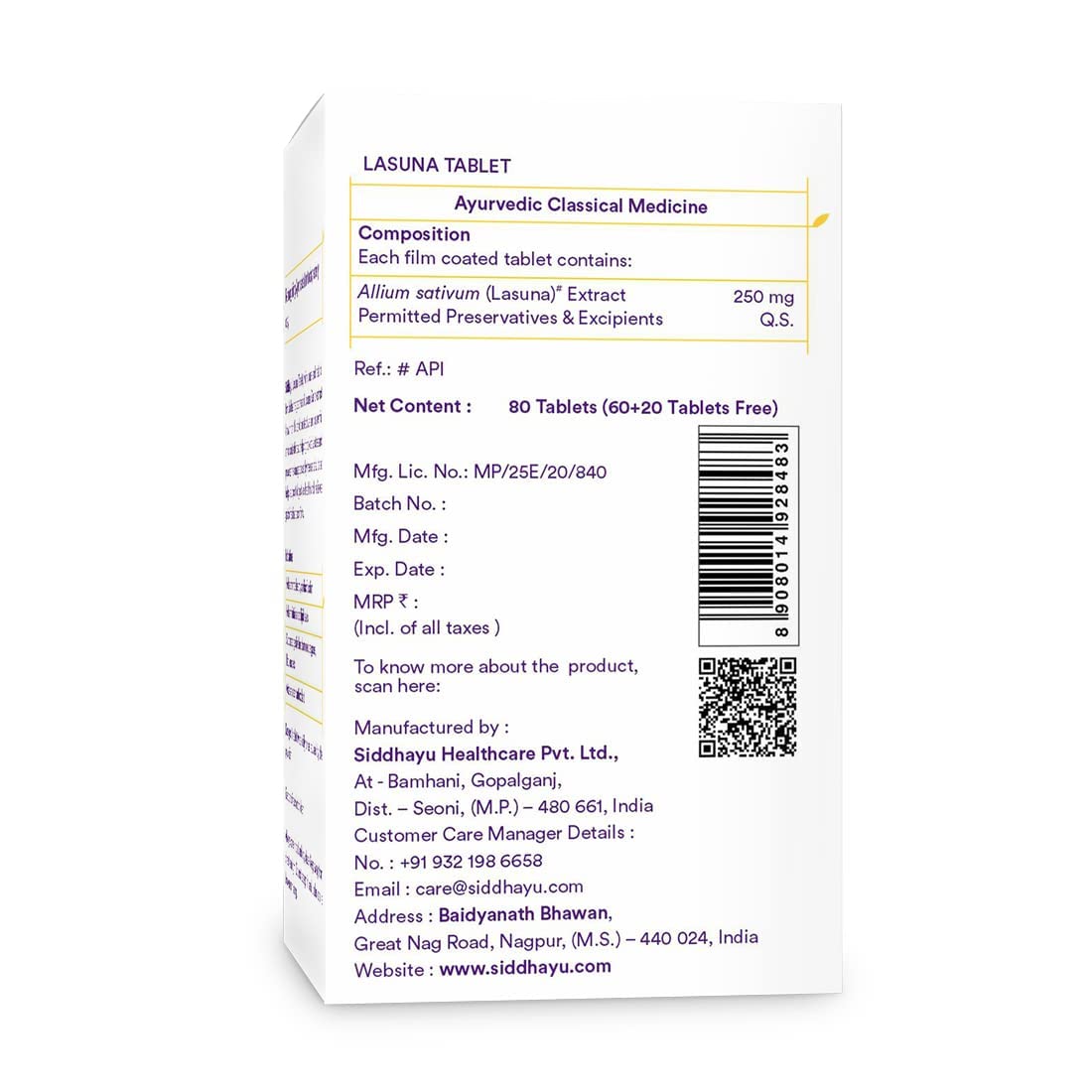 Siddhayu Lasuna Garlic Tablet | Cardiac Wellness | (From the house of Baidyanath) | Improves Digestion | Balance Cholesterol Levels | 60 + 20 free Tablets