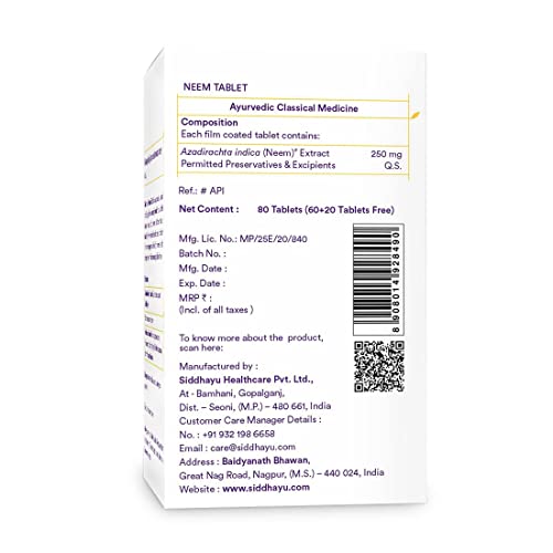 Siddhayu Neem Tablet (From the house of Baidyanath) | Natural Skin Support | Blood Purifier Anti Acne and Pimples | (60 + 20 Tablets Free)