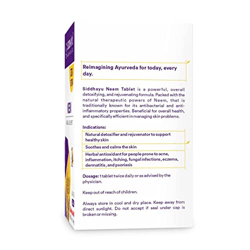 Excellent Skin Therapy: Neem is a super herb with every part of the tree root bark fruit flower and leaves having therapeutic properties. Neem is a detoxifying agent that helps rejuvenate from within. The Siddhayu Neem Tablet contains pure & natural Neem