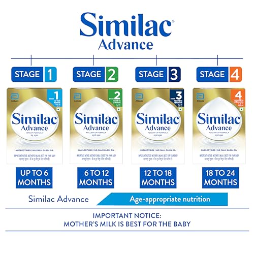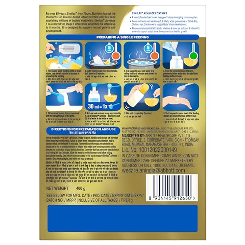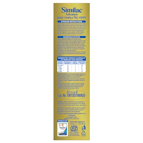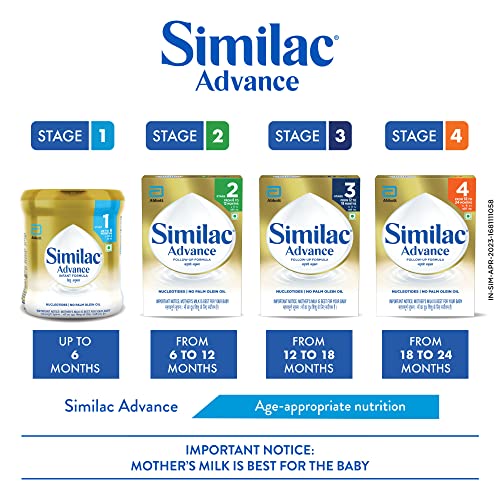 Similac Advance 1 is a spray dried stage 1 infant milk substitute for new born baby upto 6 months. Similac Advance is designed to support normal growth and development. It contains Essential fatty acids Vitamins and Minerals (such as Calcium and Iron) that are known to support healthy growth of the baby. Contains Neuro-nutrients such as Omega 3 and 6 fatty acids (Precursors of DHA & ARA) Choline Iron Taurine Iodine Folic Acid and Zinc that are known to support babyâs brain development. Also contains level and blend of nucleotides that is known to support babyâs developing immune system For over 85 years Similac from Abbott Nutrition has set the standards for science-based infant nutrition and has been nourishing millions of babies worldwide. Follow the suggested feeding schedule as given on pack. Standard reconstitution is one level scoop of powder for each 30 ml of water. Do not use fewer scoops than directed since diluted feeding will not provide adequate nutrients needed by your infant. Also do not use more scoops than directed since concentrated feed will not provide the water needed by your infant. Infant food/Infant milk substitute/Infant formula should be used only on the advice of a health worker as to the need for its use and the proper method of its use.