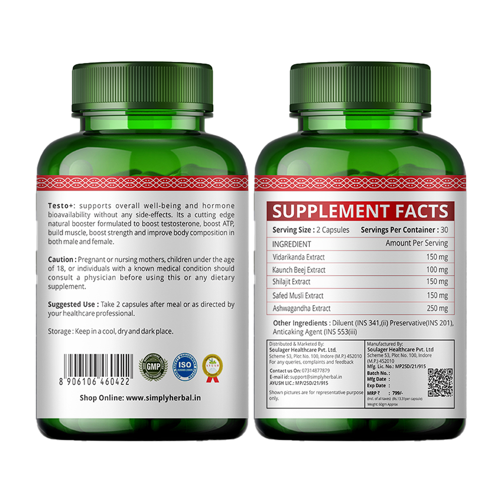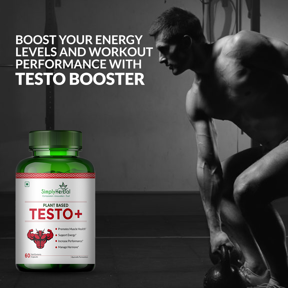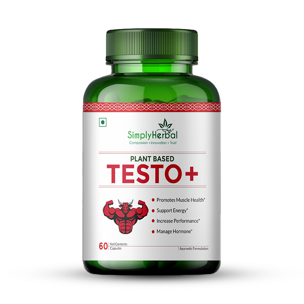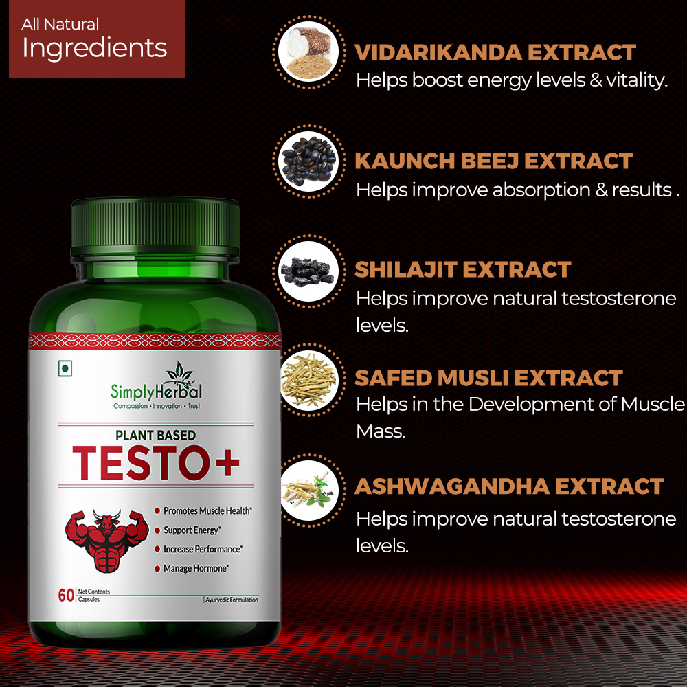 <b>BENEFITS OF SIMPLY HERBAL TESTO+ BOOSTER SUPPLEMENT</b><br><br> ~ Boost Testosterone Levels<br> ~ Improves Performance & Stamina<br> ~ Increases Endurance<br> ~ Increases Muscle Strength<br><br> <b>IMPROVES BIOAVAILABILITY AND TOTAL TESTOSTERONE LEVELS</b><br> Increases Total and Bioavailable Free Testosterone levels, which assist to promote muscle growth, strength, and endurance. It also improves libido, sexual health, and overall well-being.<br><br> <b>DEVELOP STRENGTH AND MUSCLE</b><br> Testo+ are supplements that are designed to boost testosterone levels in the body, allowing you to gain muscle and strength more quickly. Testosterone boosters are typically taken in combination with a healthy diet and exercise regimen.<br><br> <b>BOOST YOUR STRENGTH AND STAMINA</b><br> Your ability to perform at your best throughout your most challenging workouts is enhanced by having more testosterone in your body. When it counts most, you'll be able to perform longer.<br><br> <b>STRESS MANAGEMENT FOR A JOYFUL MOOD</b><br> Essential vitamins and minerals along with Ashwagandha, Kaunch Beej, and Vidarikanda let your body beat environmental & physical stress.<br>
