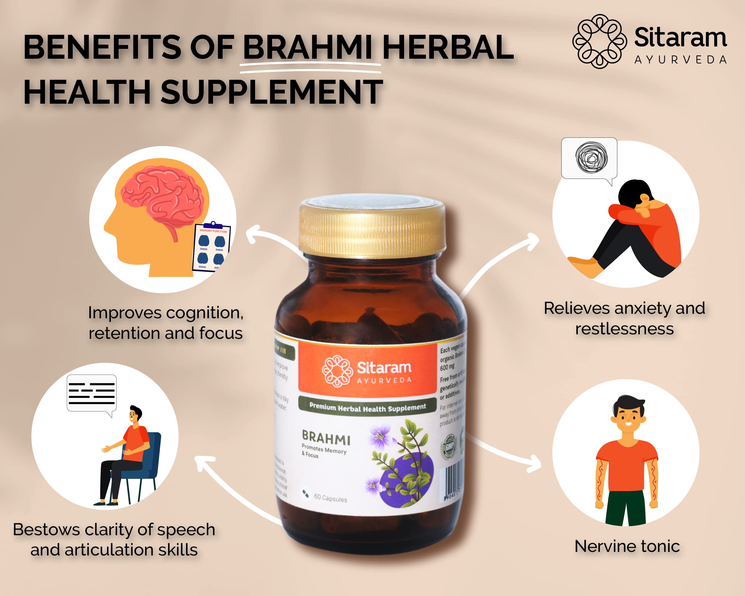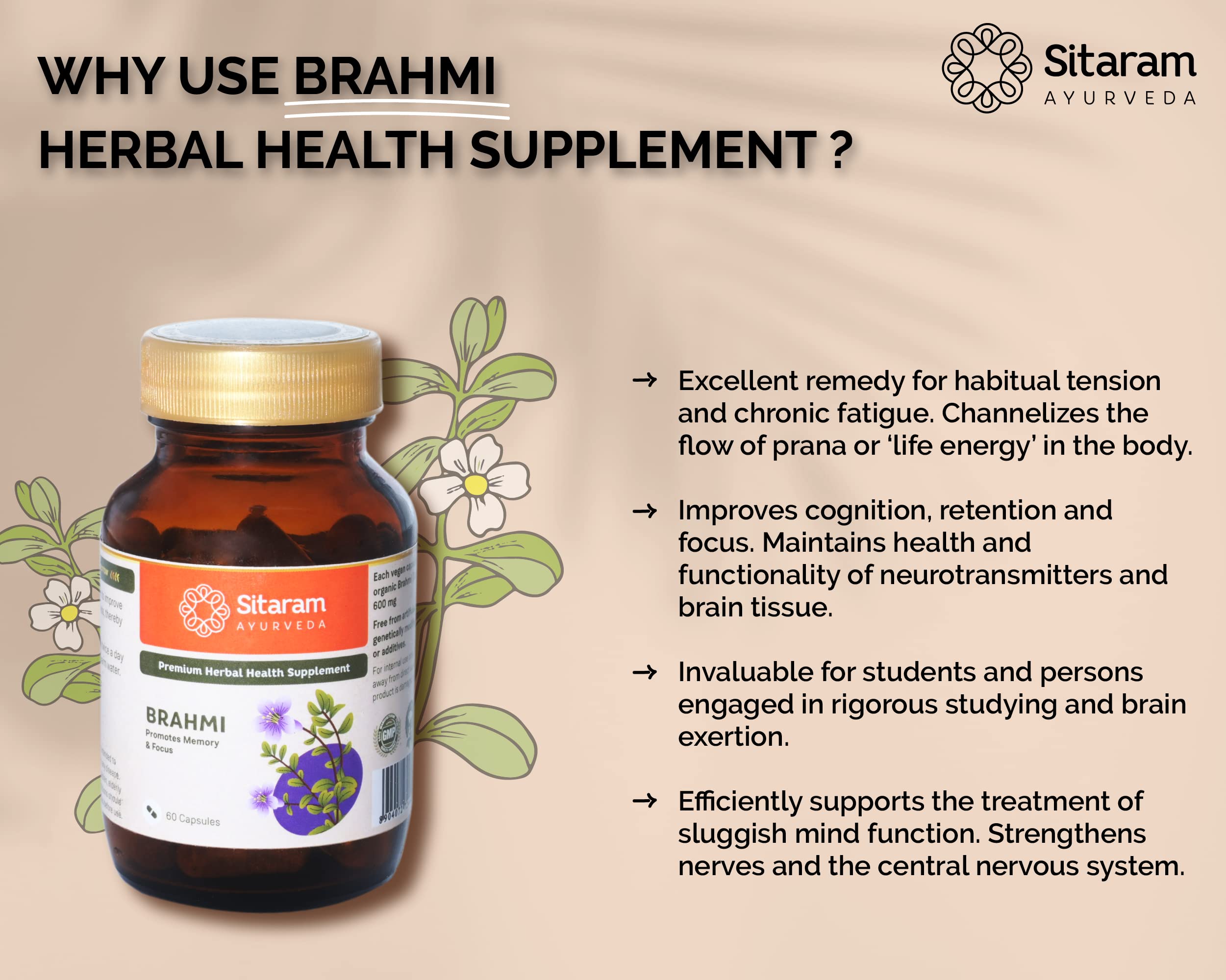 Sitaram Ayurveda Brahmi Capsule 60 Nos | More Potent 600 MG Extract (other brands - 250 MG) | Mind wellness | Improves Alertness