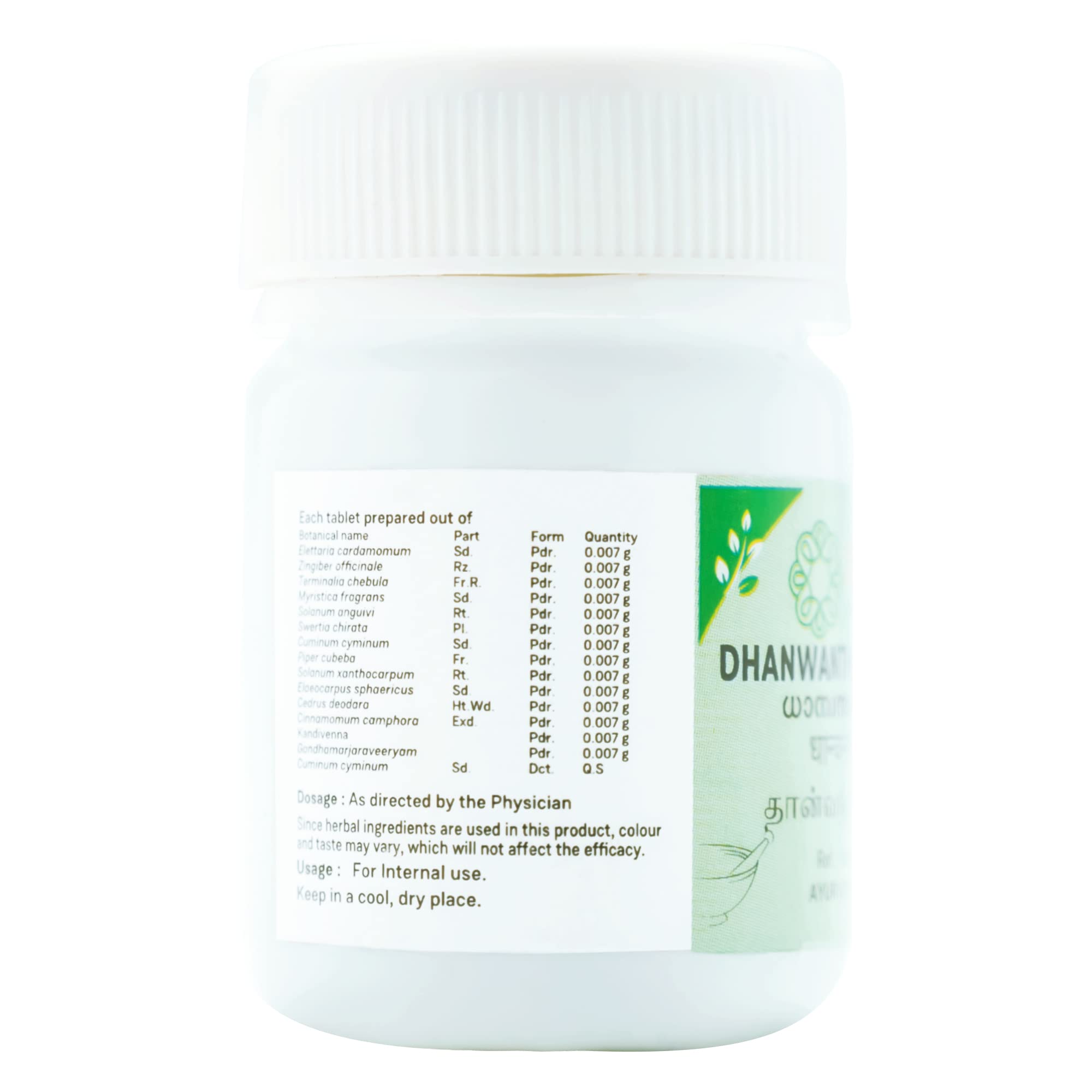 This versatile combination named after Lord Dhanwantari is a proven elixir for all kinds of derangements of Prana Vayu or the entity that regulates the smooth functioning of the and all the vital elements related to it. Dhanwantharam Gulika is a traditional Ayurvedic recipe in pill form is widely used in a broad range of ailments primarily due to Vata dosha imbalance. Clinically established efficacy is seen in conditions chronic vomiting kapha(phlegm) ailments abdominal bloating and bowel conditions. Combination of Ela (Eletteria cardamomum) Viswa (Zingiber officinale) Abhaya (Terminalia chebula) Ajaji (Trachyspermum roxburghianum) Brihati (Solanum indicum) Jeeraka (Cuminum cyminum) Bhunimba (Swertia chirayita) Rudraksha (Elaeocar pusseratus Suradaru (Cedrus deodara) Karpura (Cinnamomum um) Himambu (Rosa centifolia) Marjaraveerya (Civet cat musk).