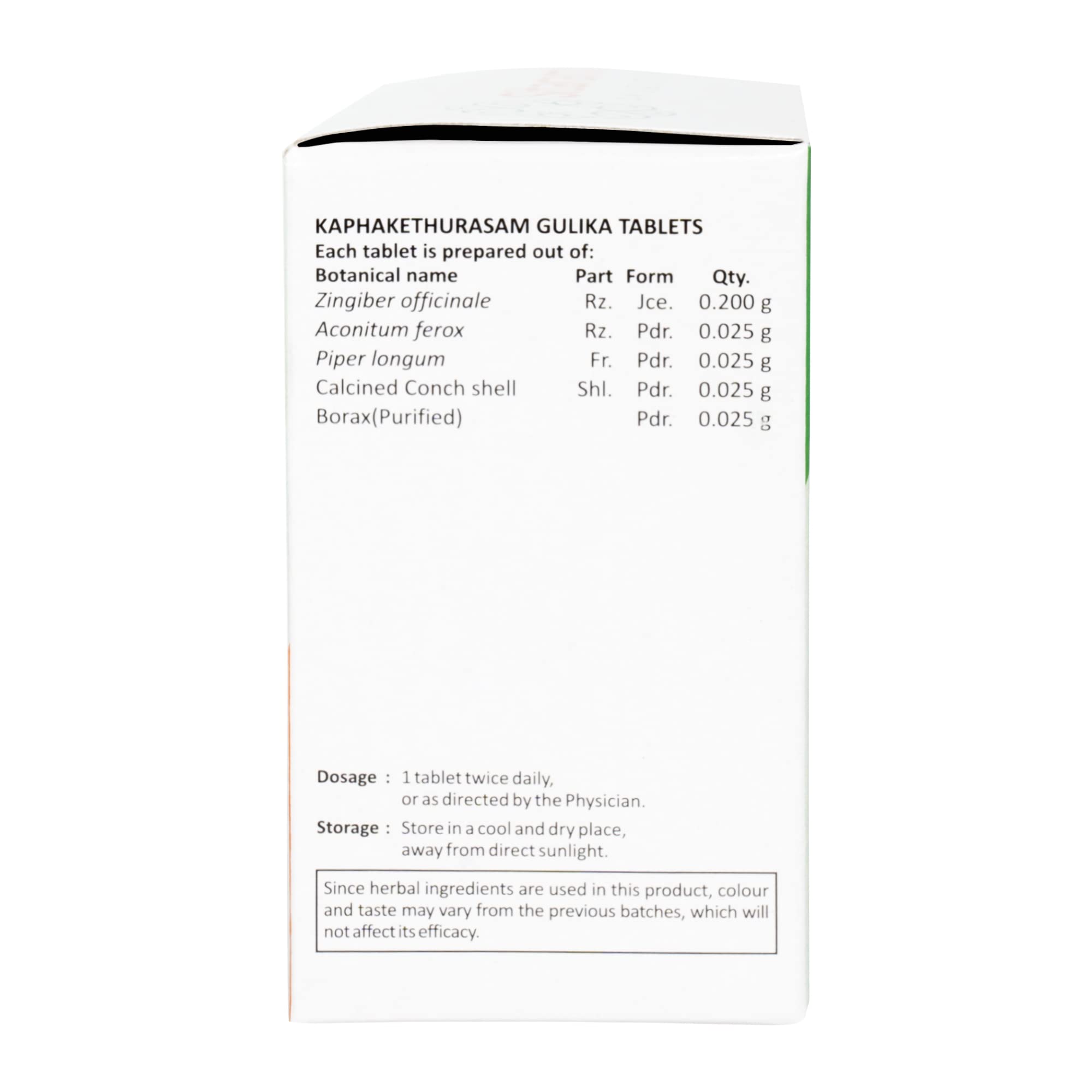 Ketu indicates brightness. Kaphaketu rasa breaks through and shatters the sluggishness and heaviness imposed by deranged kapha in the body. The uniqueness of the product lies in that it can work in very small doses even in a person with compromised and . Kaphakethurasam Gulika Tab. is a potent combination of purified Vatsanabha (Aconitum ferox) Tankana bhasma (borax) Shankha bhasma (incinerated conch shell) and Magadhi (Long pepper) ground repeatedly in ginger juice. It is beneficial in the management of and metabolic ailments.