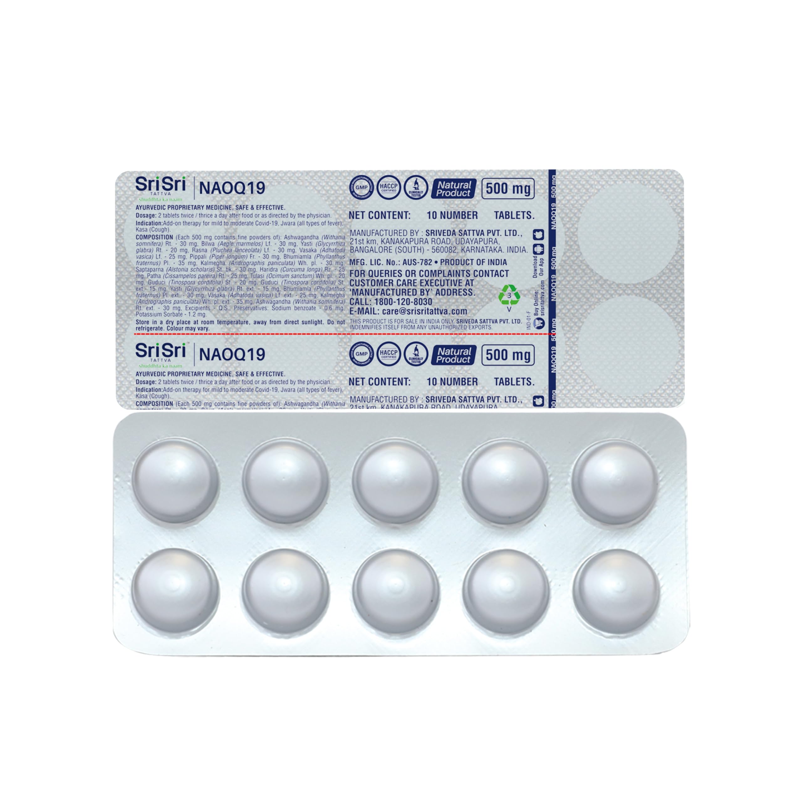NAOQ19 Anti Viral: Sri Sri Tattva brings you additional support to help build your immune system! Introducing NAOQ19 which is a carefully formulated and clinically tested product.A blend of 19 Powerful ingredients it works as an effective prophylactic against chronic viral infections.Sri Sri Tattva's NAOQ19 is a blend of ancient Ayurvedic ingredients & their extracts that help enhance & strengthen the immune system help in respiratory disorders & rejuvenate the system.Recommended use as a Prophylactic (Preventive)NAOQ19: 1 tablet 2 times a day (after food).*Or as recommended by your Physician.Recommended use for Infected Patients.NAOQ19: 1 Tablet 3 times a day (after food).*For Infected Patients (along with the standard of care recommended by your physician).Key IngredientsAshwagandha Bilwa Yasti Vasaka Pippali Kalmegha Haridra Tulasi SaptaparnaNet Weight: 60 Tabs | 500mg - Pack of 2