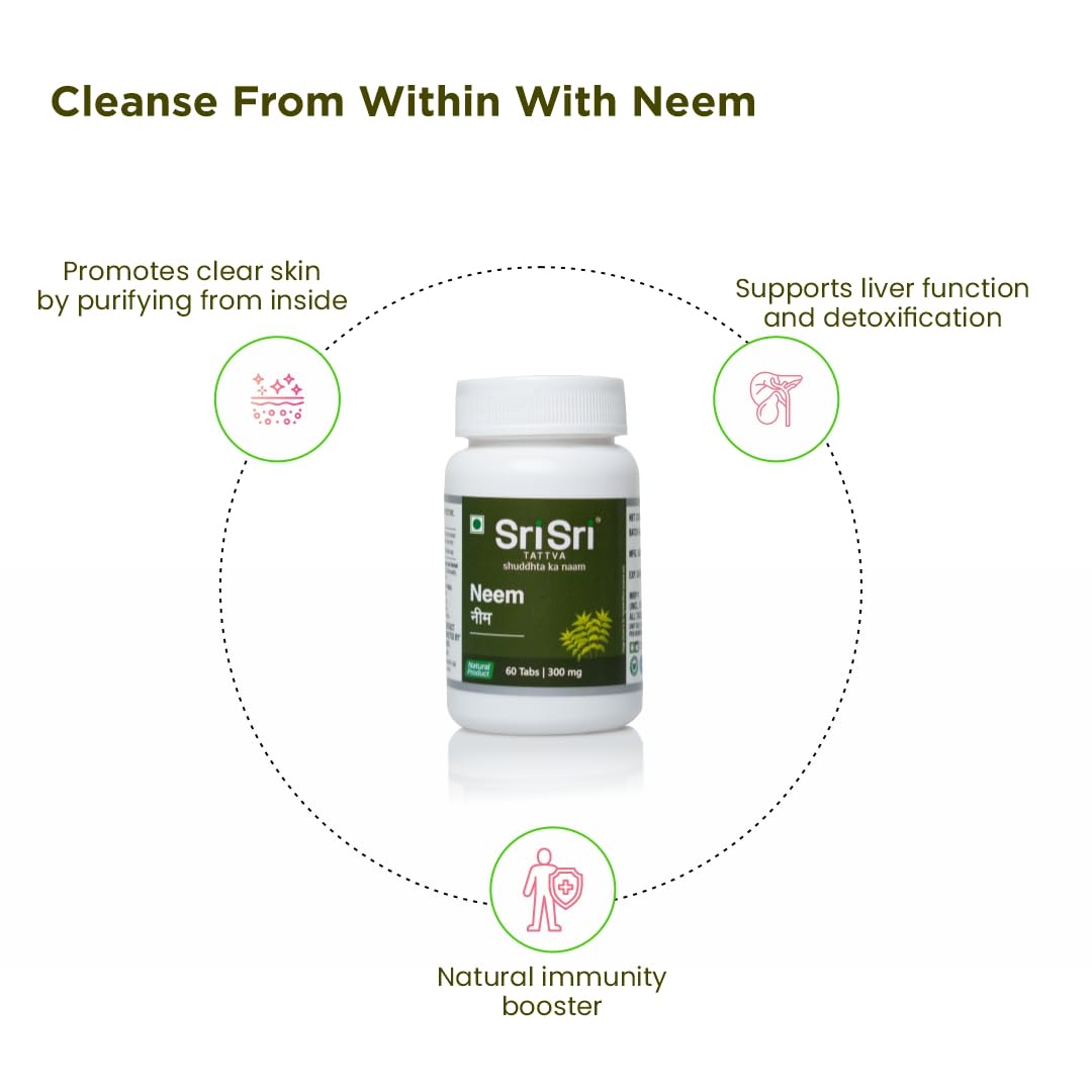 Net Content: 60Tab Secret to great skin is not only the use of external personal care products. For healthy and glowing skin the body has to be detoxified regularly. Sri Sri Tattva Neem tablets purify the blood and hence keep your body healthy and you skin glowing and supple. Neem is mentioned in most Ayurvedic formulations for the treatment of skin disorders because of its detoxifying properties. The growth of acne-causing bacteria is inhibited by Neem. The antioxidant and reduction of gastric acid production properties of the Neem are effective in healing ulcers. It is also very effective in Urinary disorders. Net weight : 300 mg
