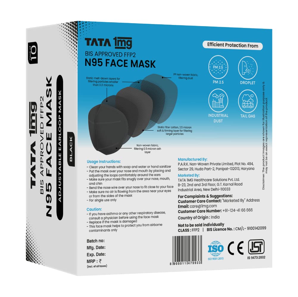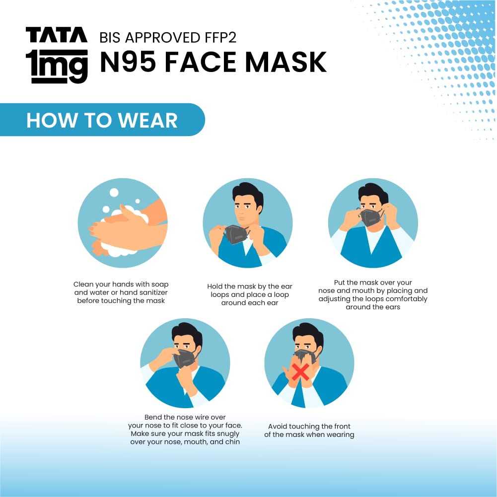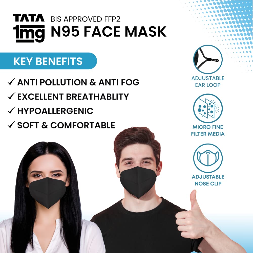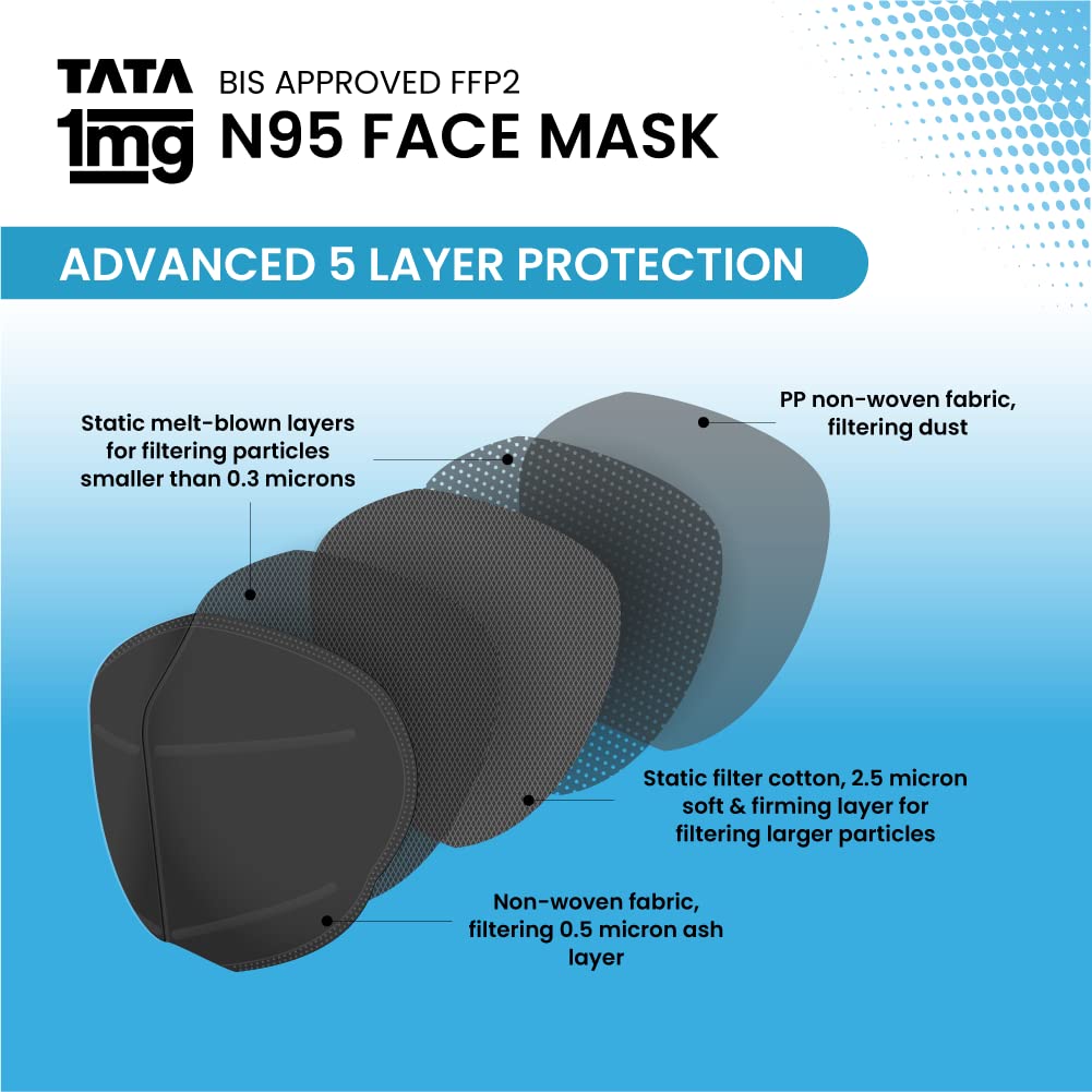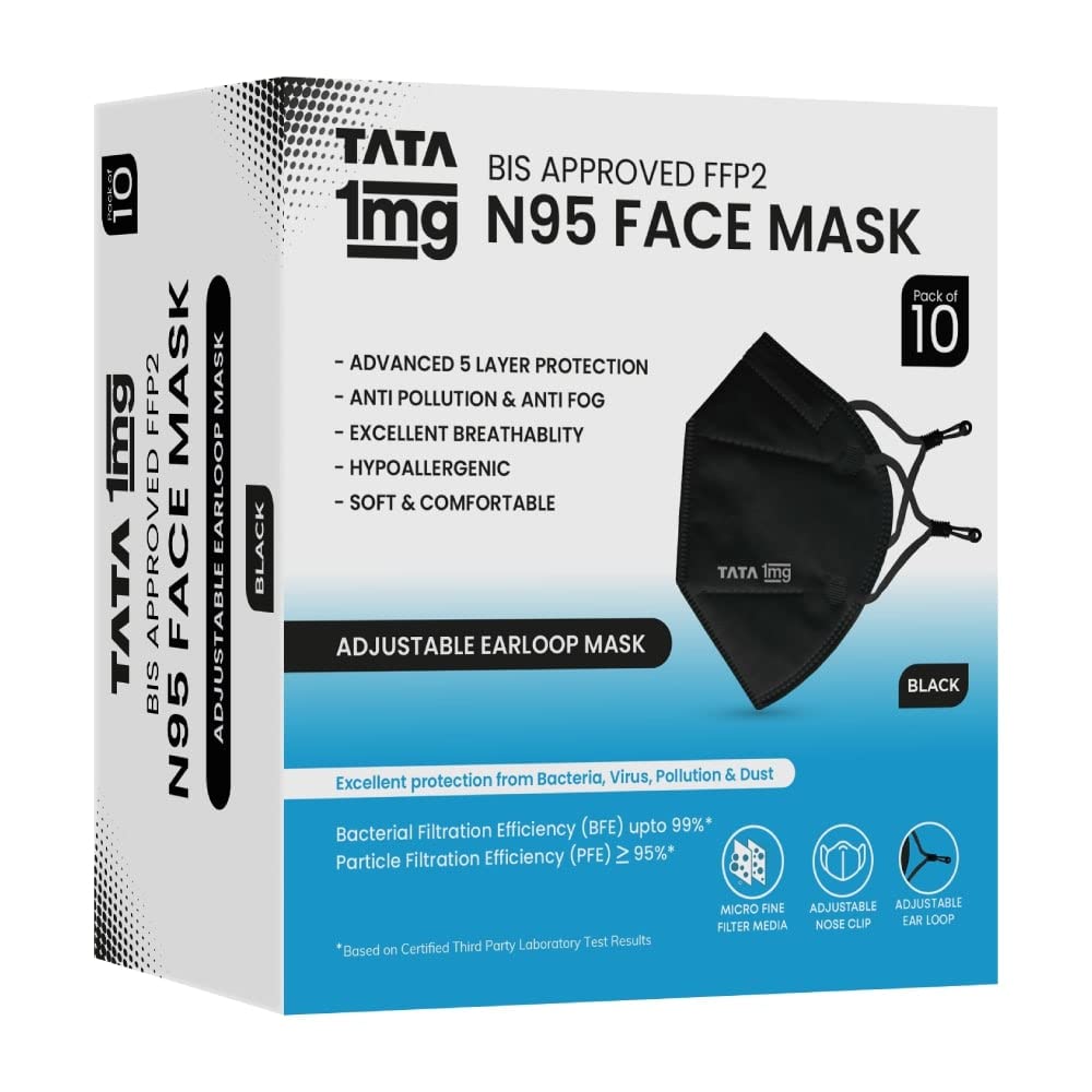 Product highlights1. It offers advanced 5 layer protection from harmful elements2. It is an Anti-pollution and anti-fog face mask3. This face mask provides excellent breathability4. Hypoallergenic soft and comfortable5. It is with adjustable earloops for better fit and comfort6. It has a Bacterial Filtration Efficiency (BFE) of upto 99%7. It has a Particle Filtration Efficiency (PFE) ⥠95%Tata 1mg BIS approved FFP2 N95 Mask with adjustable Ear Loop Pack of 2: comprises 5 protective layers. This mask has been rigorously tested and provides excellent protection against bacteria viruses pollution and dust. It has a Bacterial Filtration Efficiency (BFE) of up to 99% and Particle Filtration Efficiency (PFE) of up to 95%.