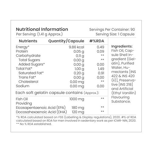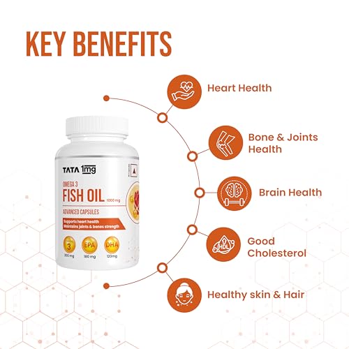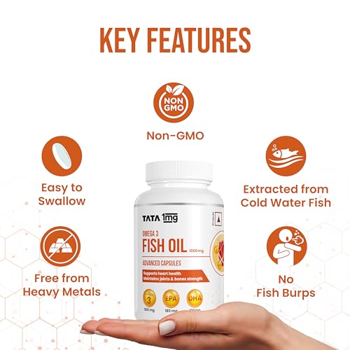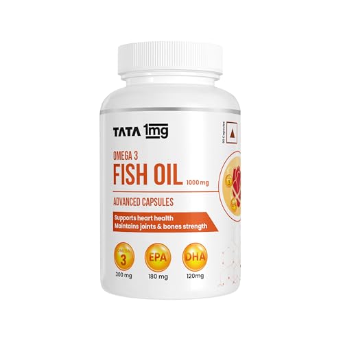 Tata 1mg Omega 3 Fish Oil Capsule contains 1000 mg of fish oil which provides essential omega-3 fatty acids (180 mg of EPA and 120 mg of DHA). Omega 3 fatty acids may help reduce the risk of heart problems by regulating triglycerides and supporting joint and muscle functioning as well. Fish oil for cholesterol ensures they remain in check and helps maintain optimal cardiac functions. These fatty acids also support skin and eye health and brain and cognitive health.