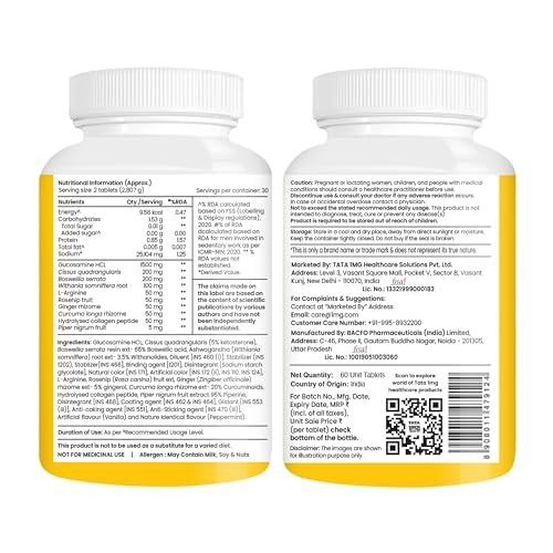 Tata 1mg Glucosamine HCL 1500 mg Tablet with Boswellia, Rosehip, Collagen, Arginine for Joint Support, For Men & Women, Non-GMO & Soy-Free (60 Tablets)