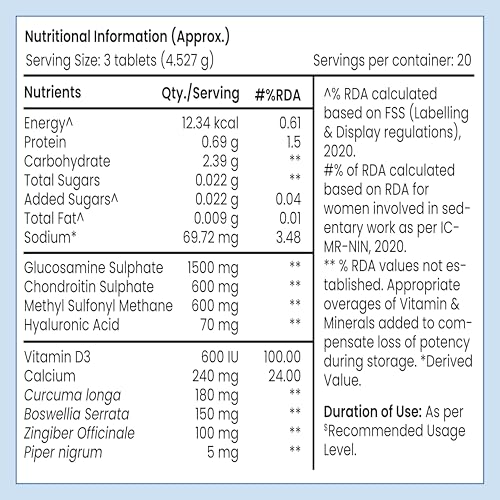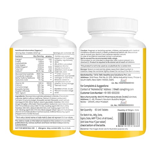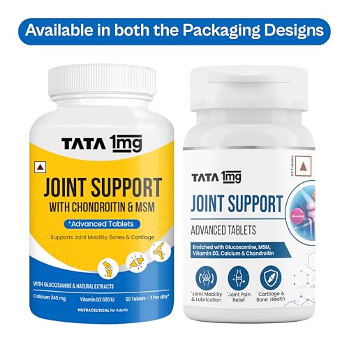 Tata 1mg Joint Support Advanced Tablets are packed with Glucosamine Sulphate and Chondroitin that help maintain joint and cartilage health. MSM (Methyl Sulfonyl Methane) helps relieve pain. Hyaluronic Acid is important for joint lubrication. The goodness of natural ingredients such as Boswellia Serrata Turmeric Rhizome Extract and Ginger Rhizome Extract may help with anti-inflammation and maintaining overall joint health.
