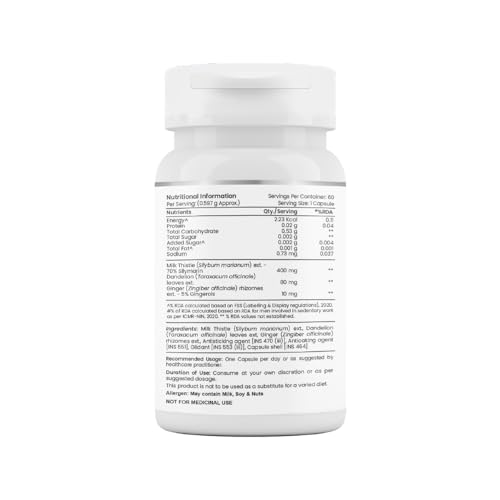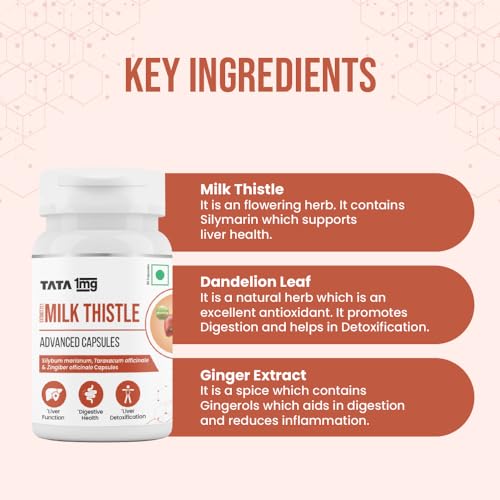 Tata 1mg Milk Thistle Veg Capsule for Liver Detox, 70% Silymarin with Dandelion & Ginger, For Liver Health,For Men & Women, Pack of 60 capsules
