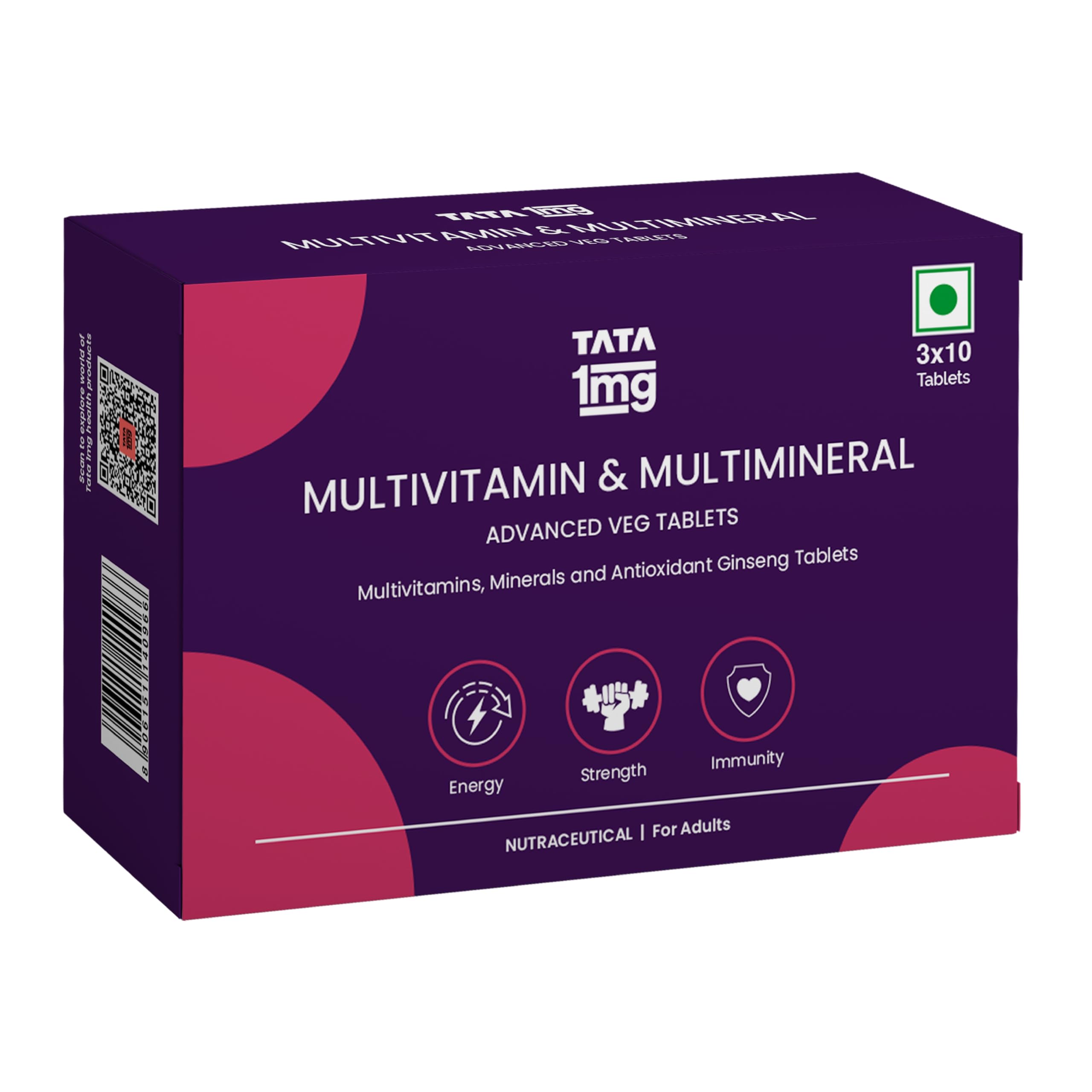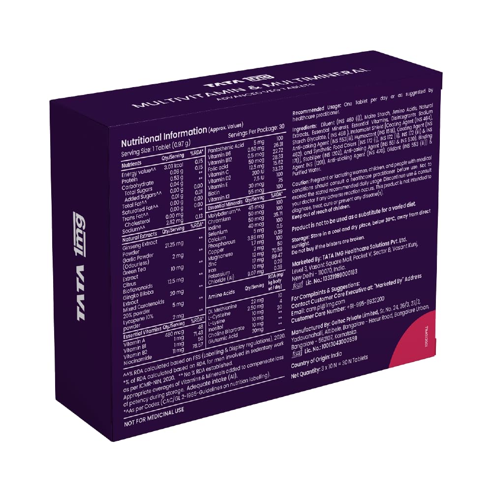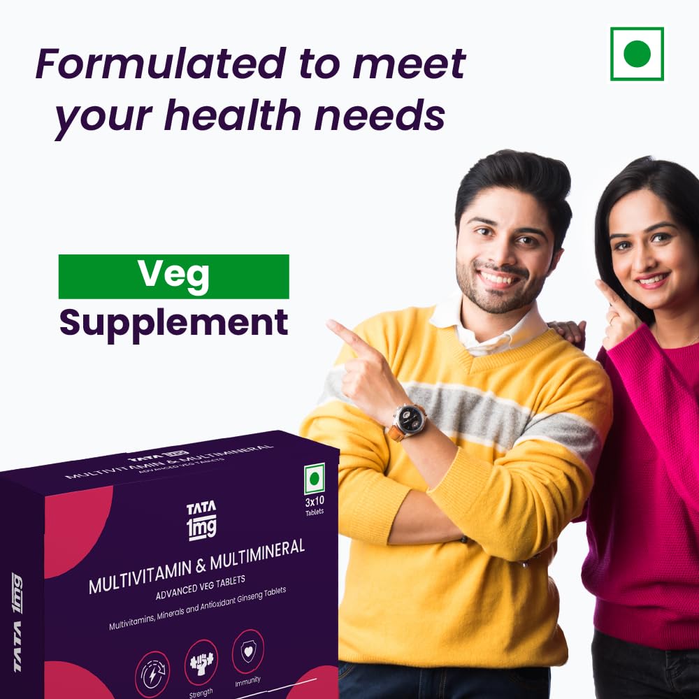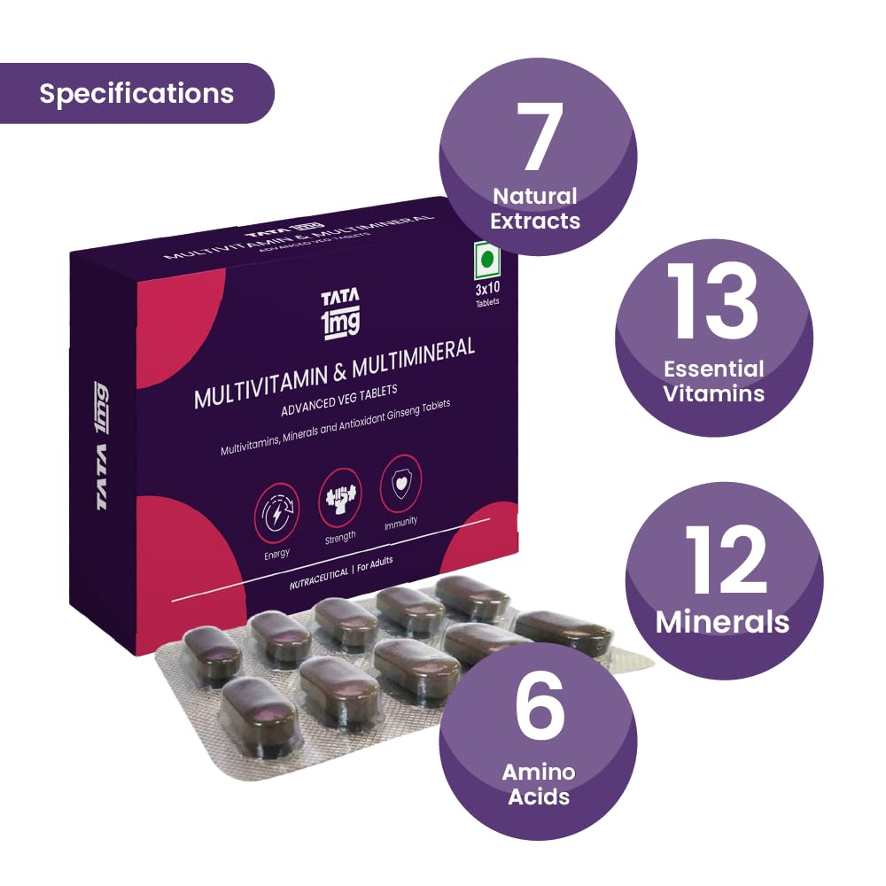 Tata 1mg Multivitamin and Multimineral Advanced Veg Tablets is your complete daily health veg supplement. It is packed with 13 essential vitamins and 12 key minerals 6 amino acids and 7 natural health extracts. It helps support immunity provide energy maintain cardiovascular health and improve fitness and strength. It helps prevent free radical damage and enhances memory and concentration and supports overall well-being.
