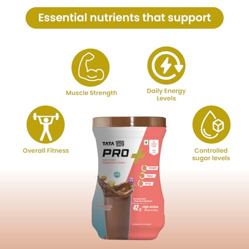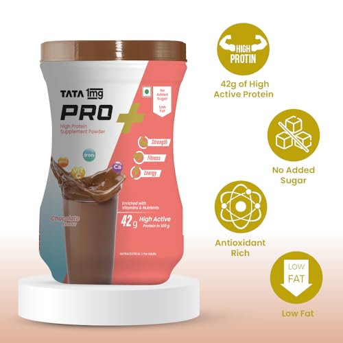 TATA 1mg Protein+ Powder (Protein supplement powder) Chocolate is a unique health supplement that contains high protein content along with other micronutrients. Protein is responsible for the proper functioning of almost all the tissues in the body: bones muscle hair and skin. Thus sufficient protein intake is essential to support muscle mass reduce fatigue and improve skin and hair condition. Tata 1mg Pro+ Powder provides protein vitamins minerals and other nutrients which help maintain your fitness energy and overall health.