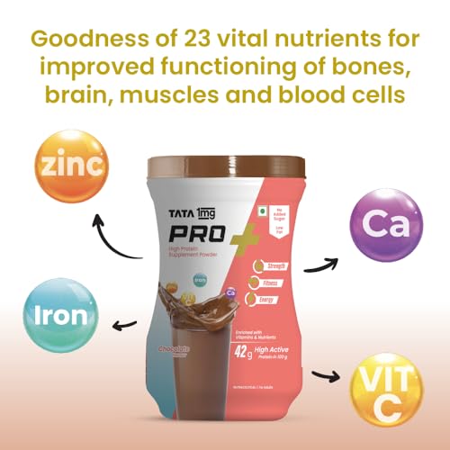 TATA 1mg Protein+ Powder (Protein supplement powder) Chocolate is a unique health supplement that contains high protein content along with other micronutrients. Protein is responsible for the proper functioning of almost all the tissues in the body: Thus sufficient protein intake is essential to support muscle mass reduce fatigue and improve skin and hair condition. Tata 1mg Pro+ Powder provides protein vitamins minerals and other nutrients which help maintain your fitness energy and overall health.