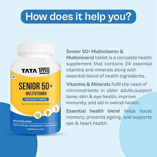 Tata 1mg Senior 50+ Multivitamin & Multimineral Veg Tablet with Calcium for Bone, Skin, Eye, Immunity, Heart & Joints, For Men & Women, Non-GMO & No Added Preservatives (Pack Of 60)