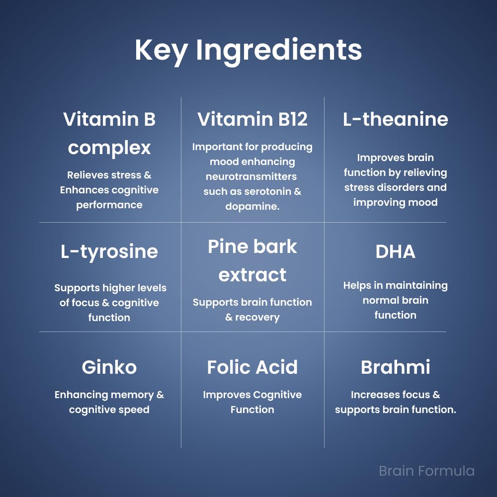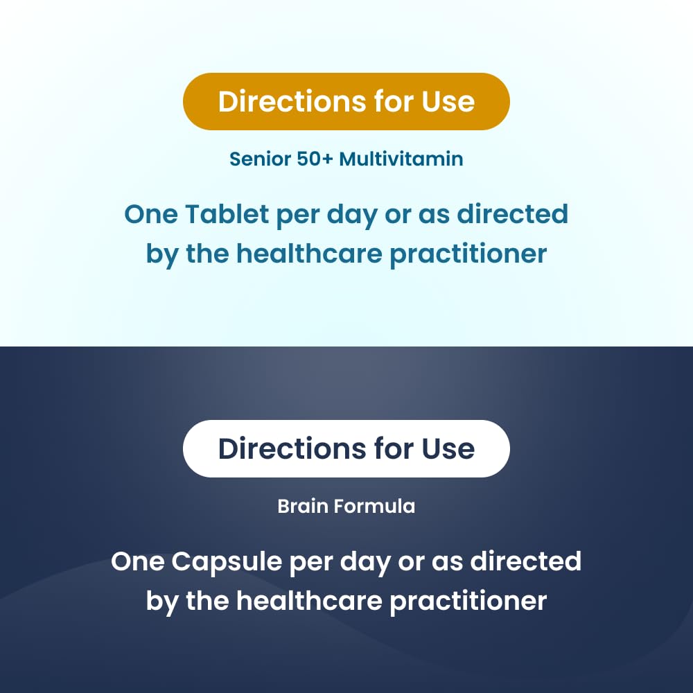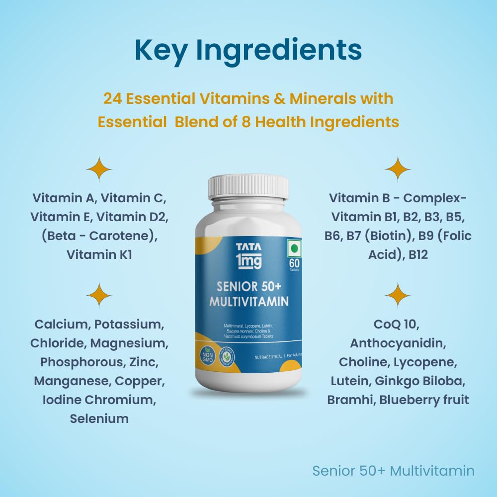 Senior 50+ Multivitamin Tata 1mg Senior 50+ Multivitamin & Multimineral Veg Tablet is a health supplement that contains 24 essential vitamins and minerals to fulfil the need for micronutrients in older adults. It may improve the immune system and support overall health. General health blend may enhance memory prevent ageing and support eye and heart health. Brain Formula Tata 1mg Brain Formula with Vitamin B Complex L-Tyrosine L-Theanine Brahmi Ginkgo and Pine Bark Extract Capsule is formulated with beneficial ingredients for the growth and development of the brain. It acts as nutrition for memory and focus. It can help stimulate the brain's functioning to improve memory and concentration.