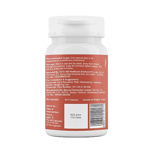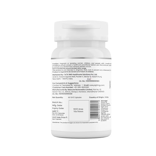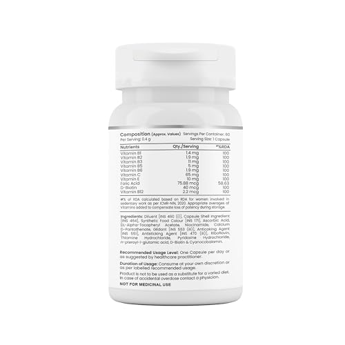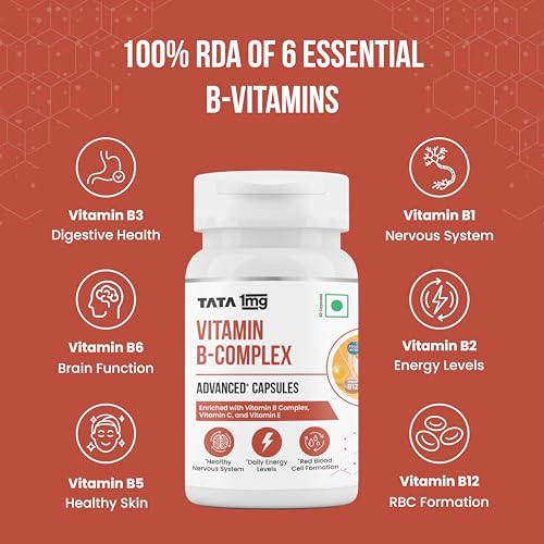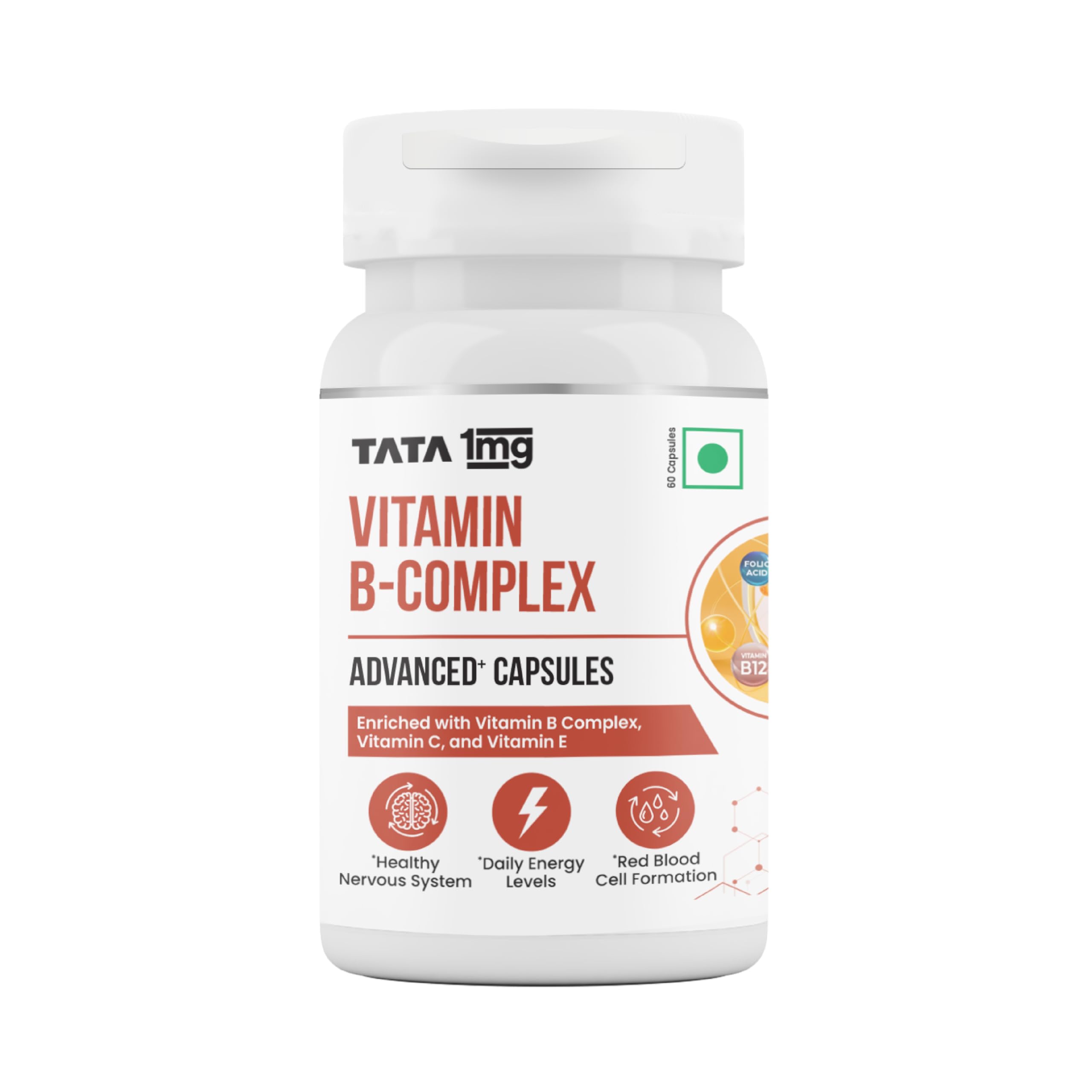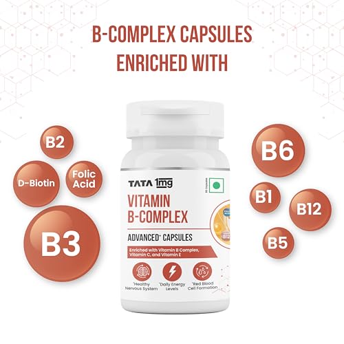 Tata 1mg Vitamin B Complex Capsules with 100% RDA for B1,B2,B3,B5,B6,Biotin, with Vitamin C and E, Helps Maintain Energy, Immunity and Skin Health, For Women & Men, Pack of 60 Vegetarian Capsules