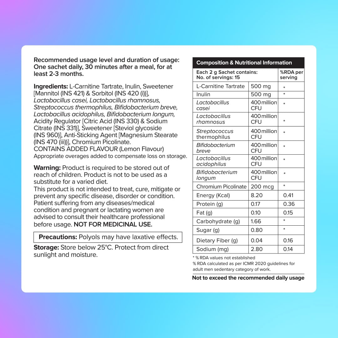 • MANAGE WEIGHT HOLISTICALLY India's first-of-its-kind Synbiotic stick with a unique formulation of precision probiotic blend of Lactobacillus & Bifidobacterium bacteria strains potent prebiotic fibre & the goodness of L-Carnitine & Chromium Picolinate whic