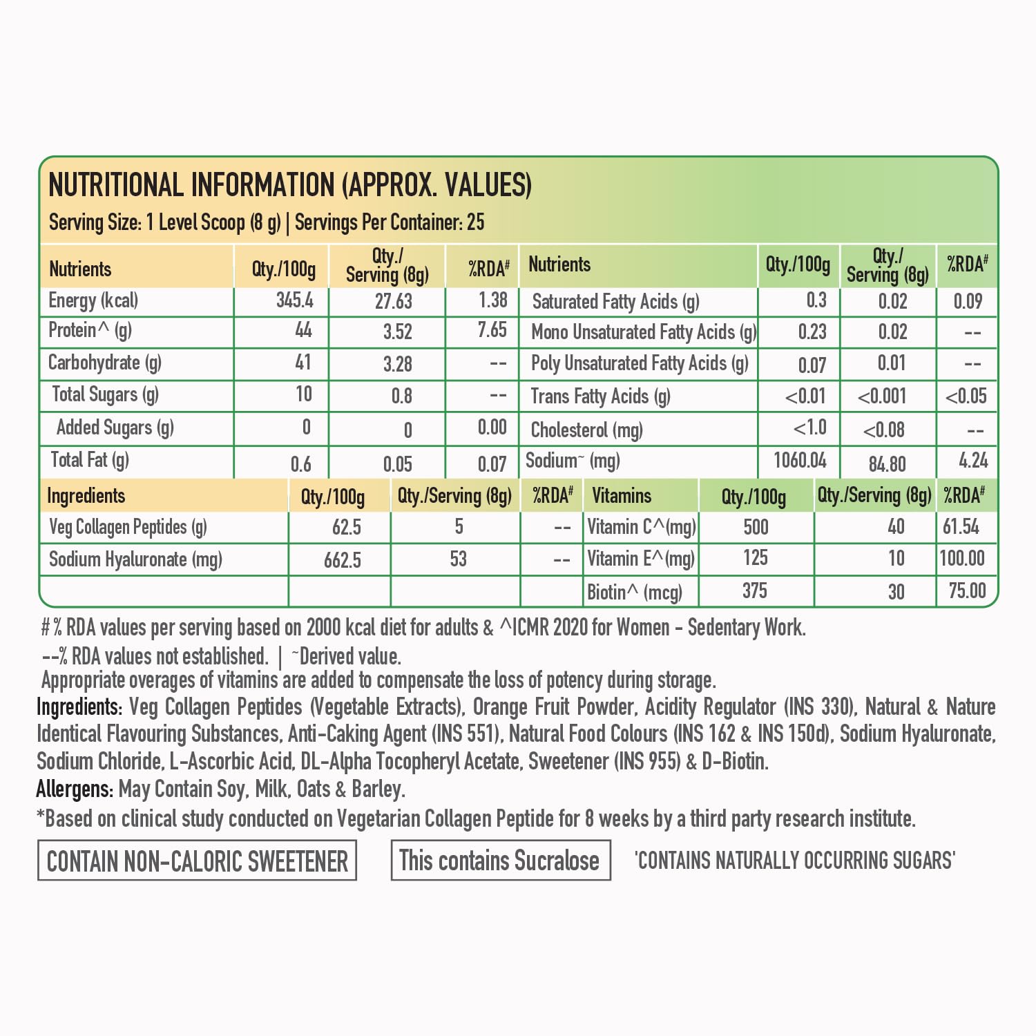 • CREATED FROM AMINO ACIDS: VegCol is created from amino acids which have been extracted from a blend of vegetables like Brocolli Carrot etc. Ketpase a nature-based blend of proteolytic enzyme is then added to help structure these building blocks into colla
