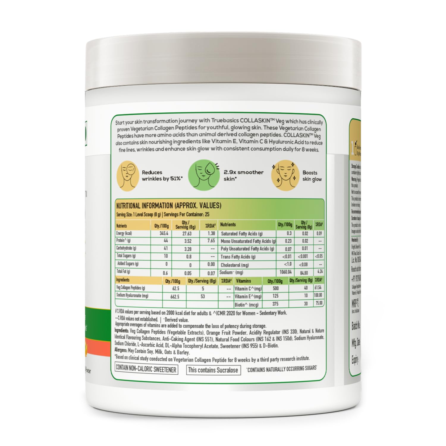 • COLLAGEN SUPPLEMENTS FOR WOMEN & MEN: TrueBasics CollaSkin Veg has VegCol (Vegetarian Collagen Peptides) which has the same amino acid profile as marine collagen (known to be more potent)