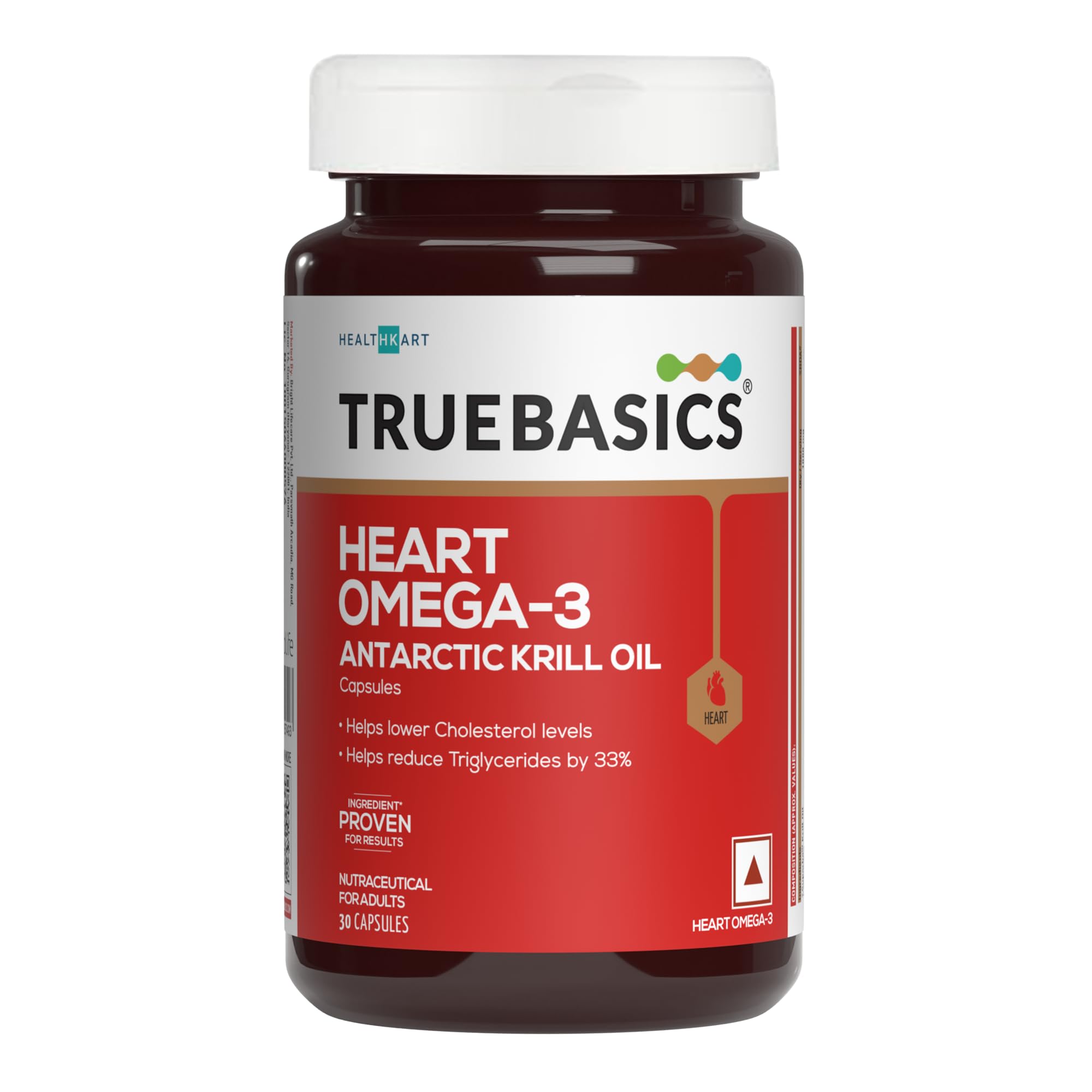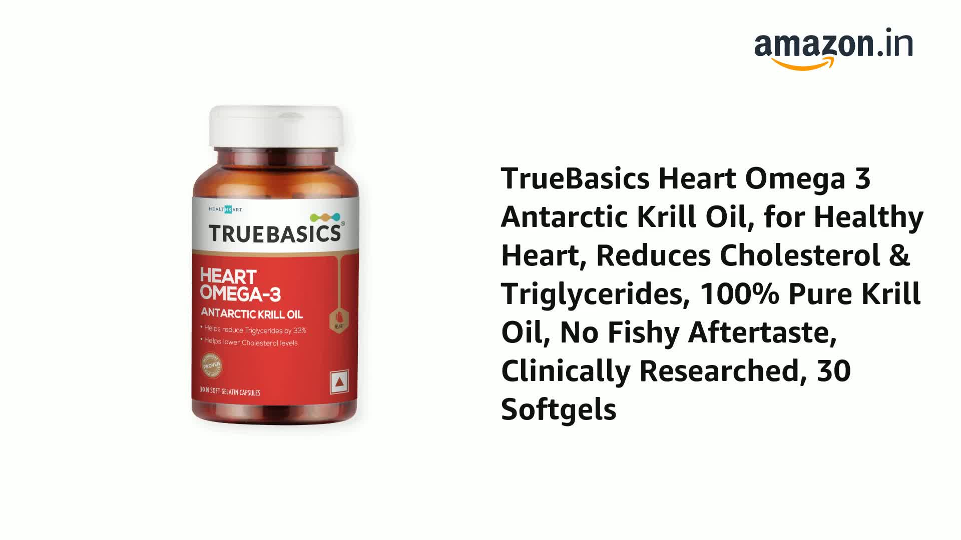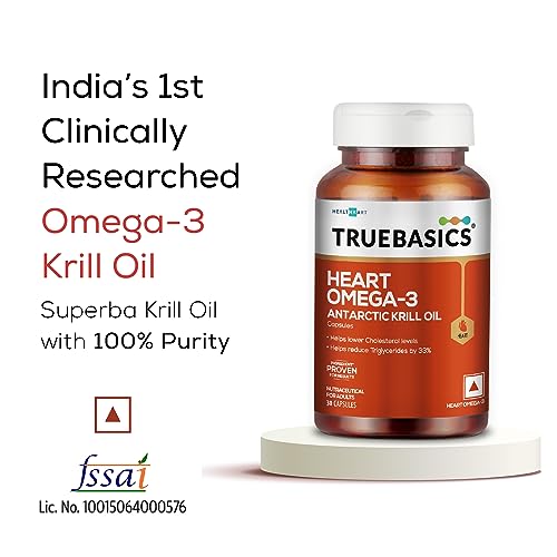 TrueBasics Heart Omega 3 Antarctic Krill Oil (30 Capsules)|With Clinically Researched 100% Pure Krill Oil|For Healthy Heart,Reduces Cholesterol & Triglycerides,1 Count