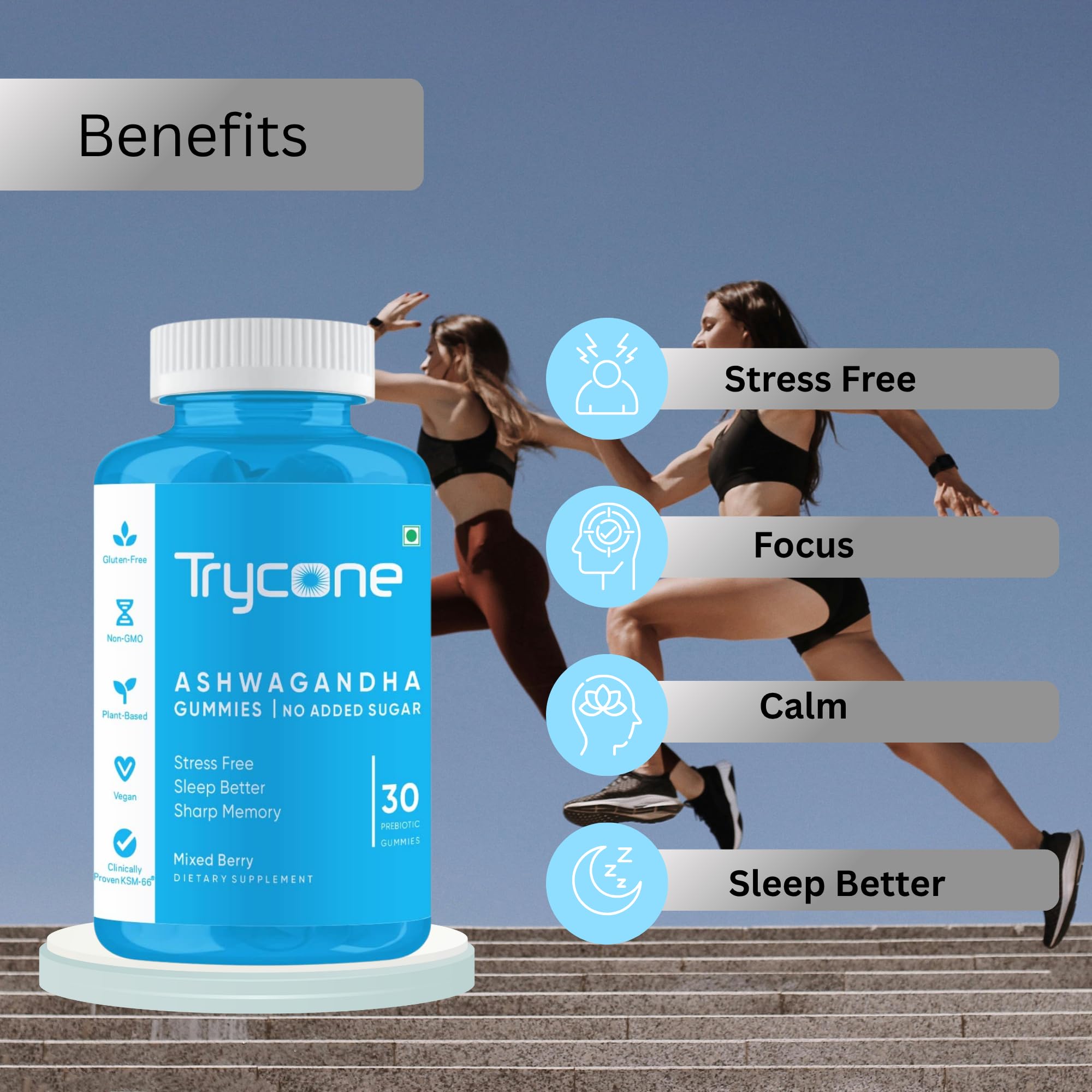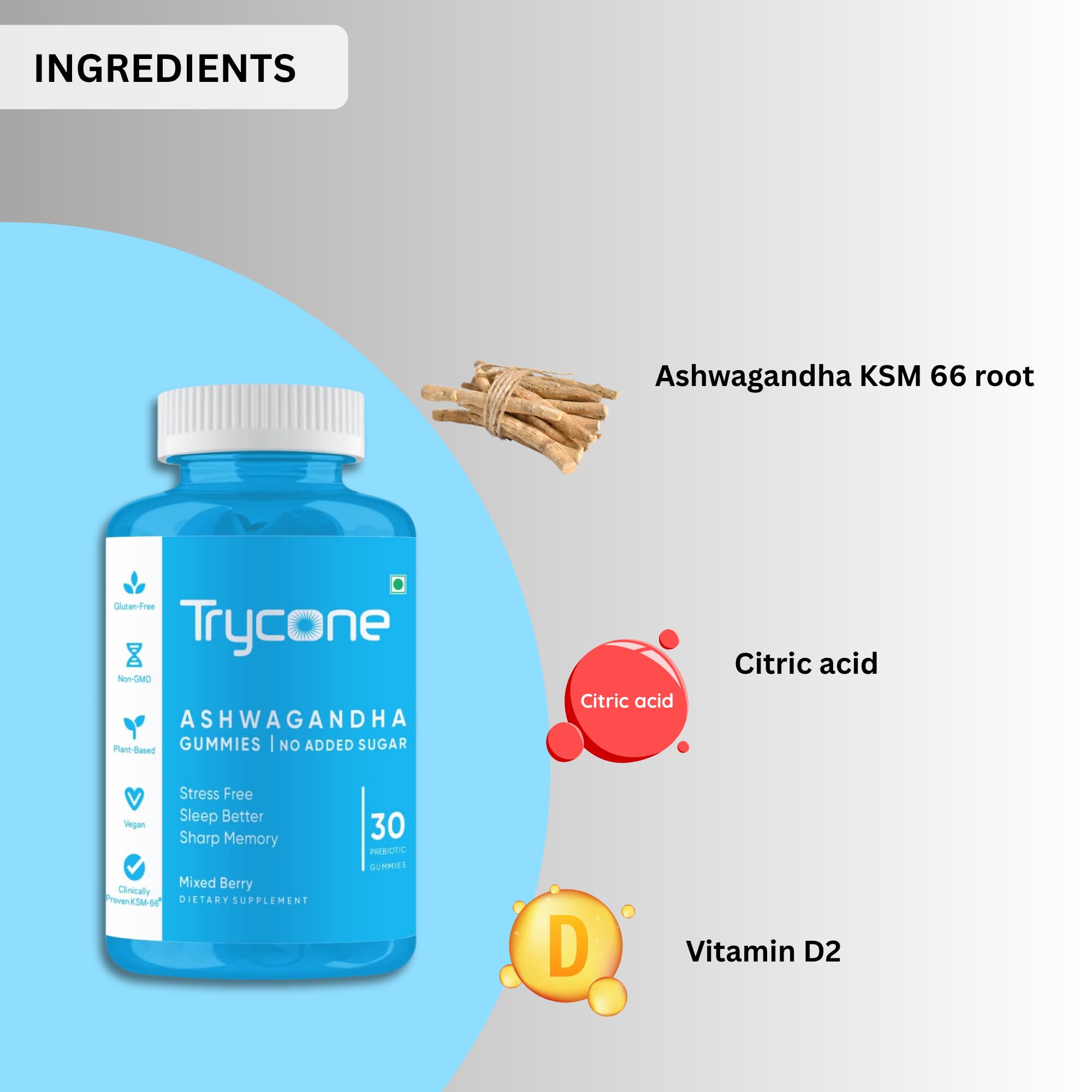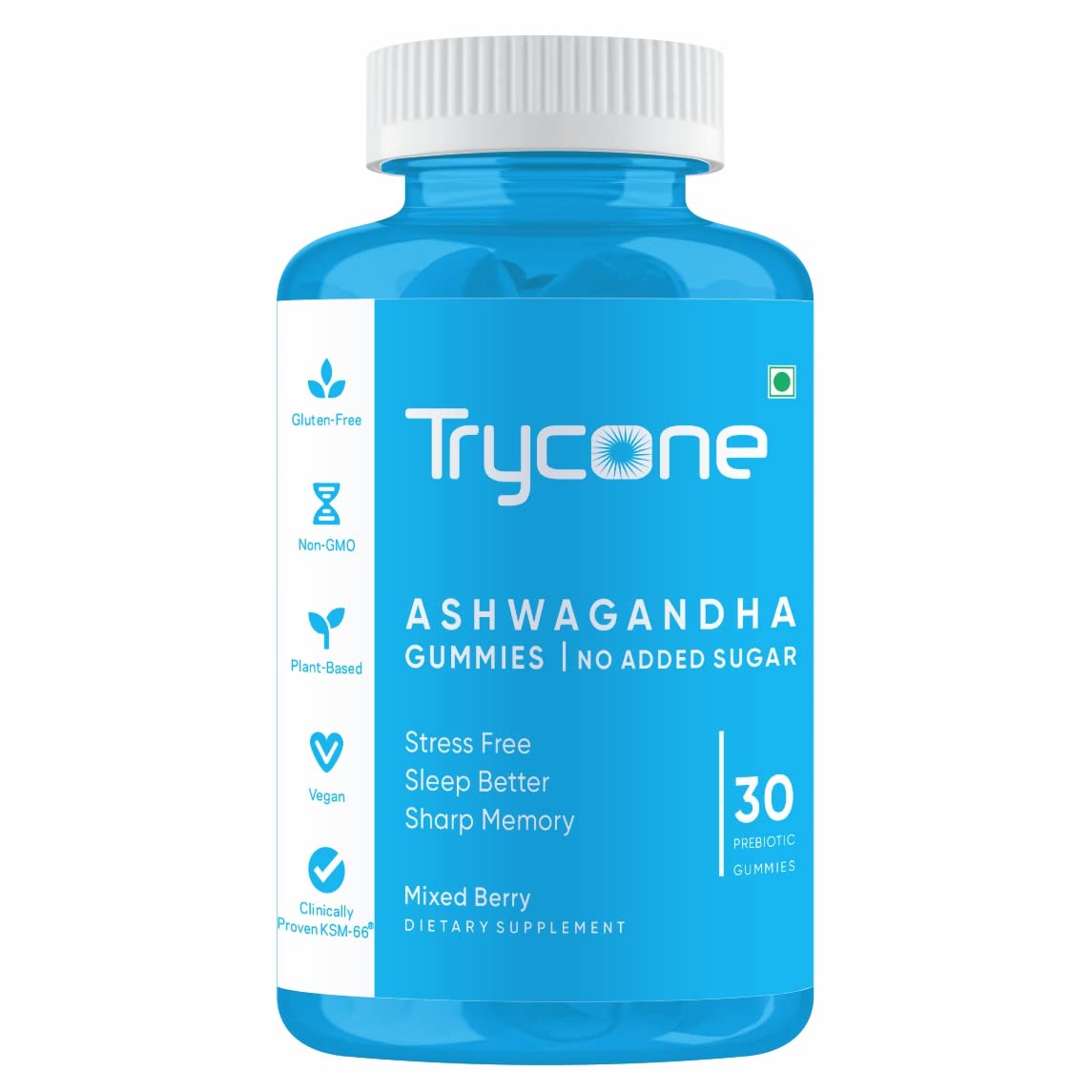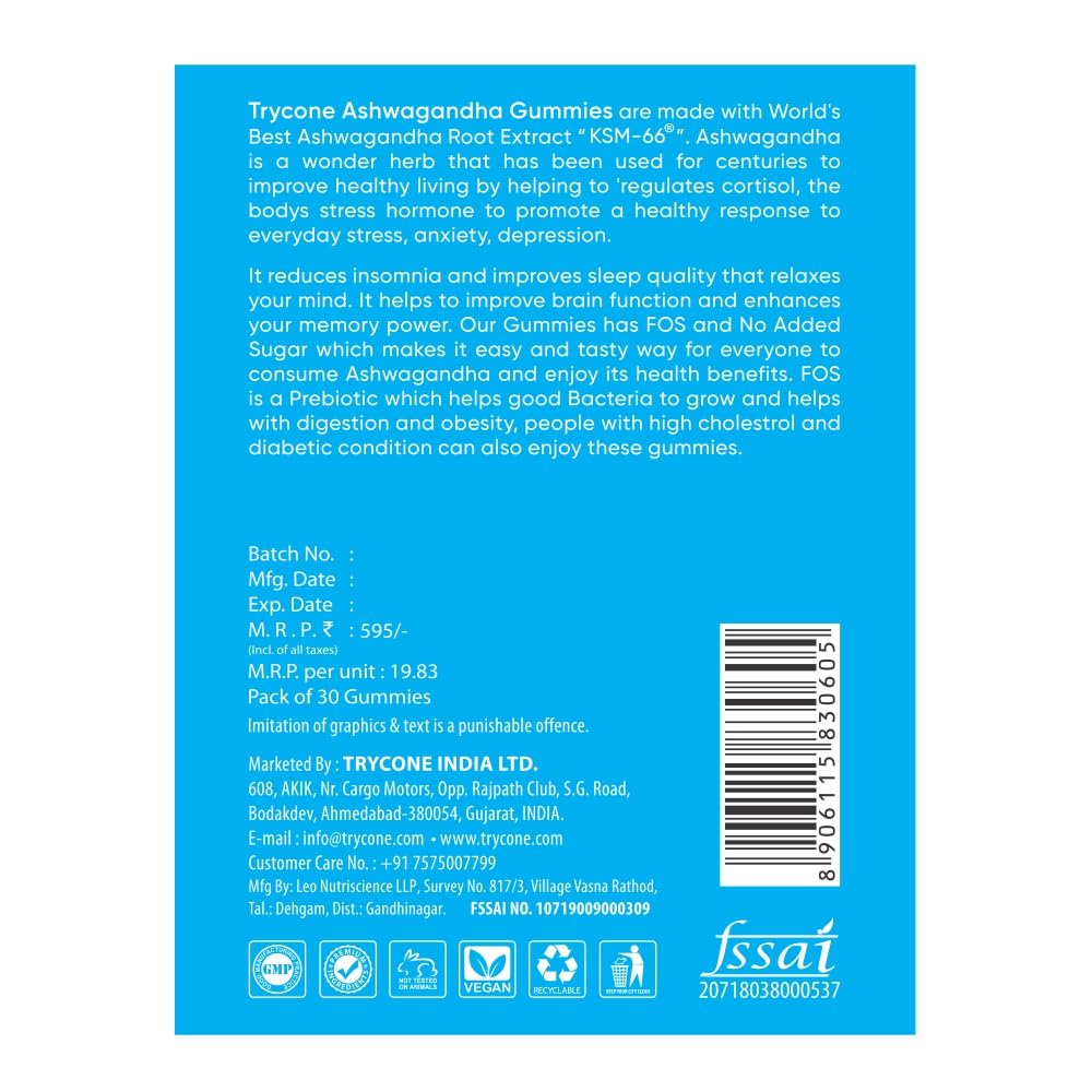 Trycone KSM66 Ashwagandha Sugar Free Gummies for Stress Relief Better Sleep and Improved Memory and Focus - Pack of 30 Gummies